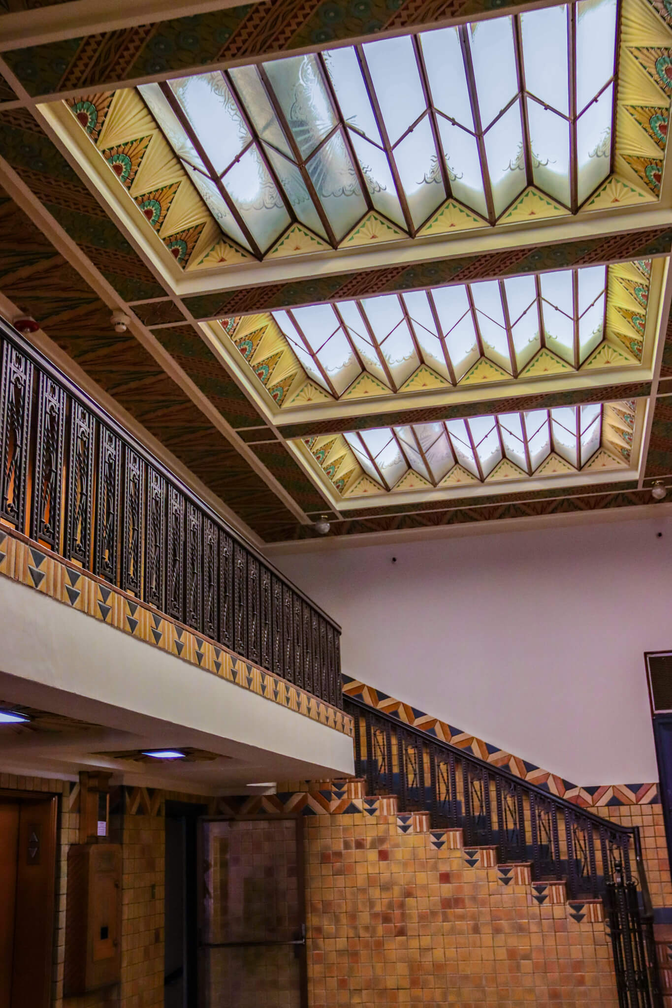 Armed with newfound knowledge and primed to see what Tulsa had to offer, I headed to the old Gillette-Tyrell Building. Constructed in 1929, it was sold only two years later to the Knights of Pythias, a fraternal organization and secret society, which promptly renamed it the Pythian Building, the moniker it still retains. The three-story building never got its intended 10-story hotel atop it (thanks to the Great Depression). Thin vertical piers divide the façade into 12 bays. The façade’s cream-colored terra cotta receives more colorful treatment at the roofline, with blue, burnt sienna, and green. Tudor-style arches grace the ground level. I stepped inside the L-shaped lobby, granting access from two separate streets, and admired the colorful tiling that runs up the lower walls as a high wainscot as well as the equally colorful tiled floor that was modeled on a Native American blanket pattern. On the ceiling, bracketed beams decorated with seashell and triangle designs separate recessed panels, from which hang eight tall, slender chandeliers, each with four etched glass panels that terminate in a triangle design at both the top and bottom. A beautifully tiled staircase leads up to a second-floor mezzanine with handsome wrought-iron railings, the perfect spot to admire the large lighting fixture that passes itself off as a skylight, its glass lens designed to resemble a folded plate.