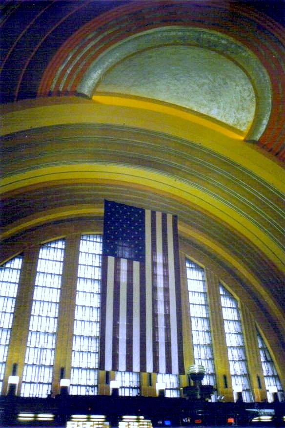 Entering the grand station, I passed under an enormous American flag into the main concourse. My eyes were immediately drawn upward, to the bands of yellow and orange around the arch and encircling the rotunda, and to the two massive mosaic murals curving around the rotunda. Each mural—an astounding 22 feet high and 110 feet long—portrays the city’s history with images of covered wagons, locomotives, and steamships, farmers and factory workers, all in rich, vibrant colors.