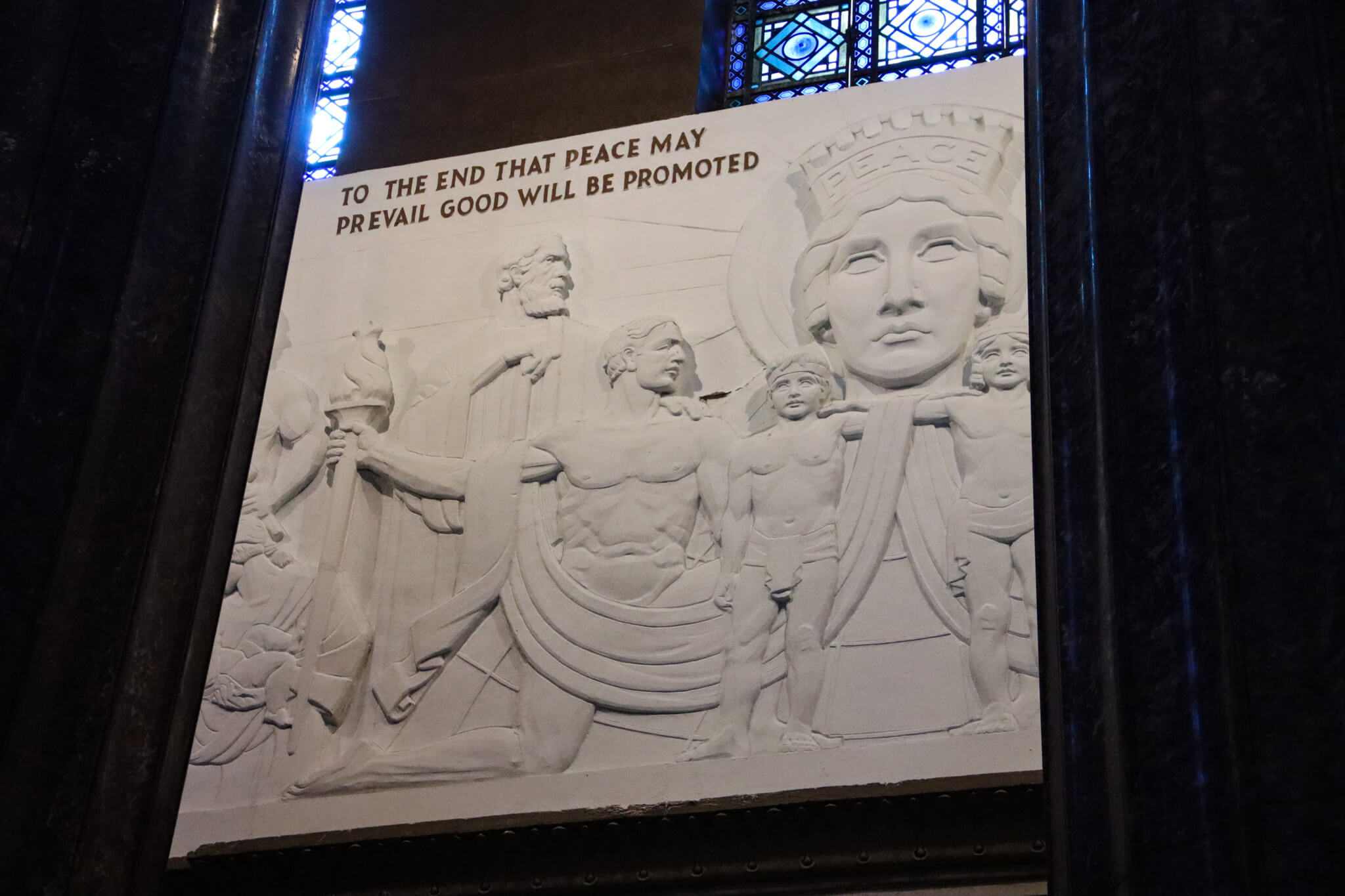 Clad in materials collected from all the allied nations of World War I, the shrine’s walls bear the names of all the Indiana military personnel who fought in the war. Sixteen fluted marble columns, four on each side, are capped with gilded Corinthian capitals. Behind them, tall, brilliant, deep-blue stained-glass windows allow muted natural light to enter. A terrific white plaster frieze with allegorical bas-relief figures wraps around the room, depicting key events and guiding forces of the war, with golden captions that read, for instance, “Unity of Effort Leads Our Arms to Victory,” “Realizing Their Obligation, Mothers Nobly Give Their Sons,” and “Public Order Maintained and Freedom Under Law Perpetuated.”