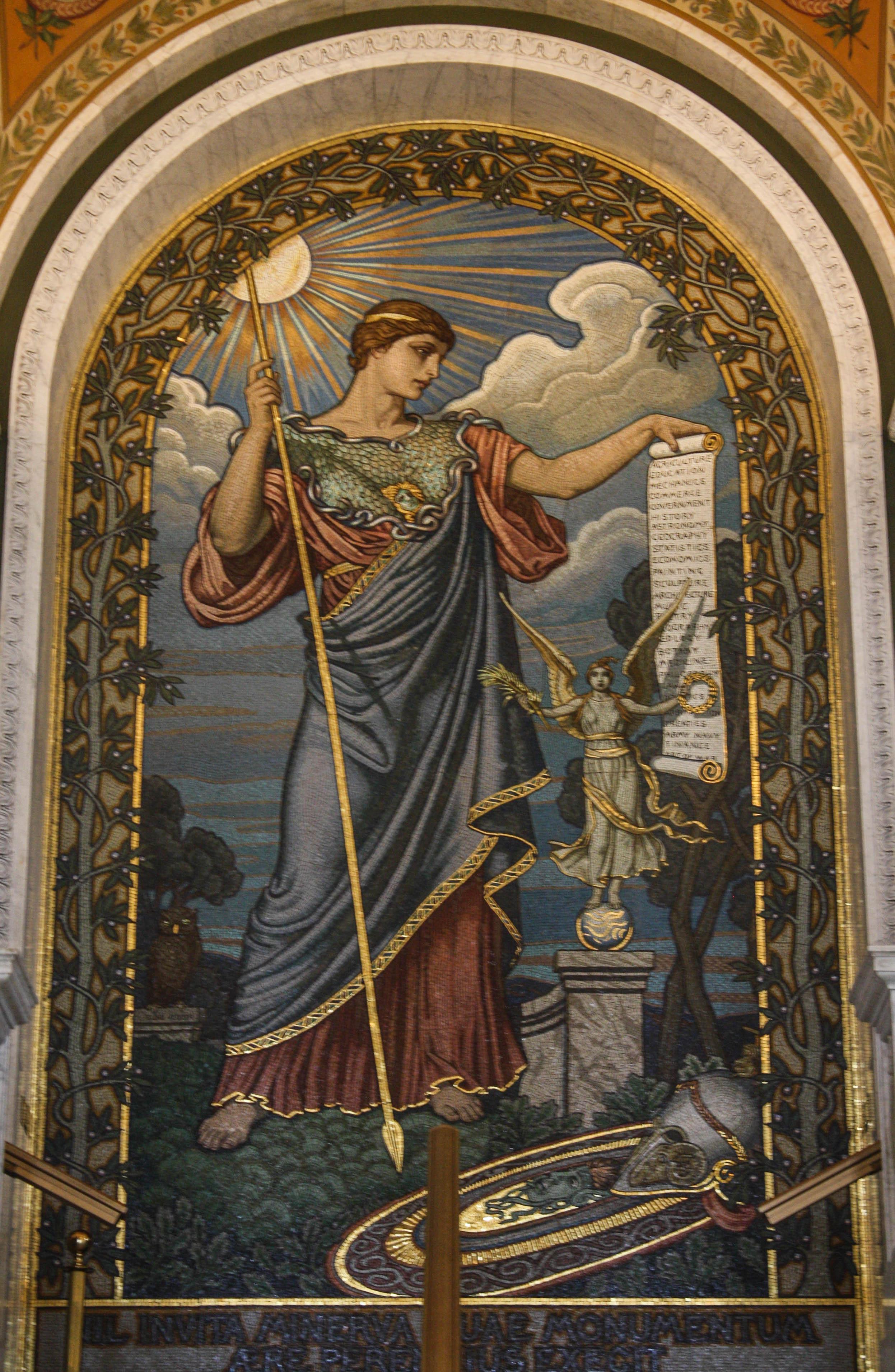 The only space I wanted to explore that remains off limits to the casual visitor is the Main Reading Room. However, through the windows in the Visitor’s Gallery next to the tall mosaic Minerva of Peace, I was able to look inside at researchers conducting their endeavors amid a spectacular setting of arches, columns, and balustrades; portrait statues of artists, commercial innovators, historians, philosophers, poets, religious leaders, and scientists; and allegorical figures representing those same fields—all under a coffered domed ceiling that rises 160′ above the floor and whose lantern features a female figure representing human understanding, ringed by a dozen figures personifying countries that have contributed to the evolution of Western civilization: Greece for philosophy, for example, Italy for fine arts, England for literature, and so on.