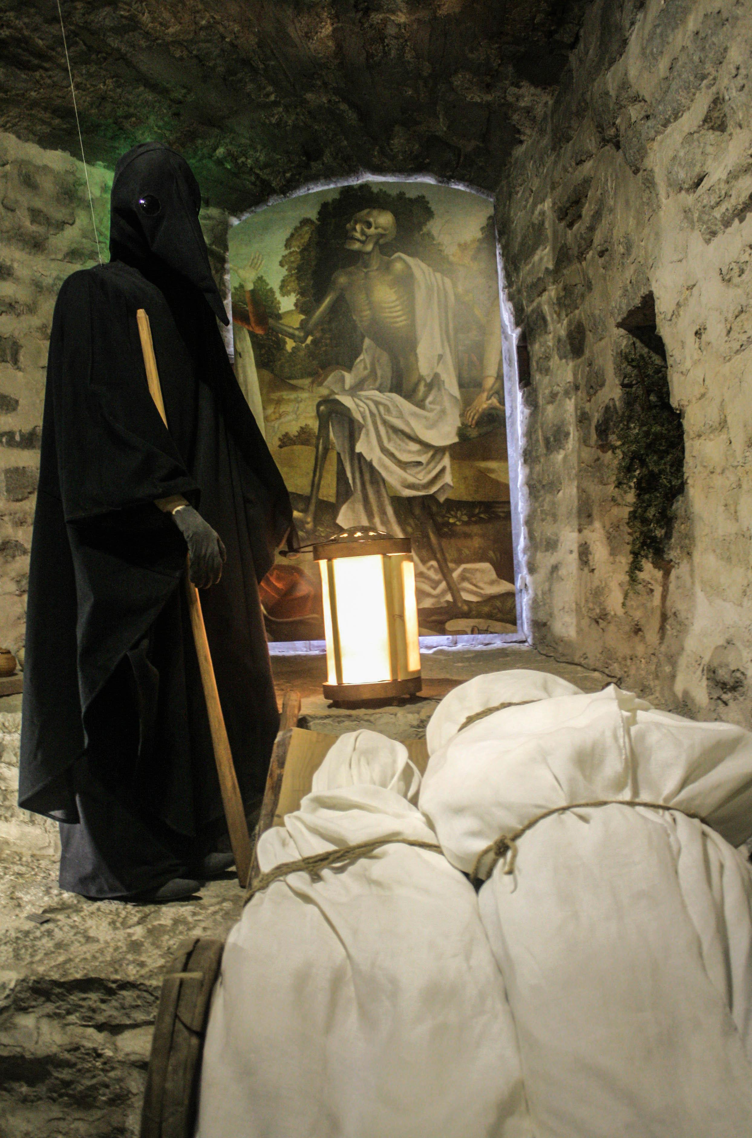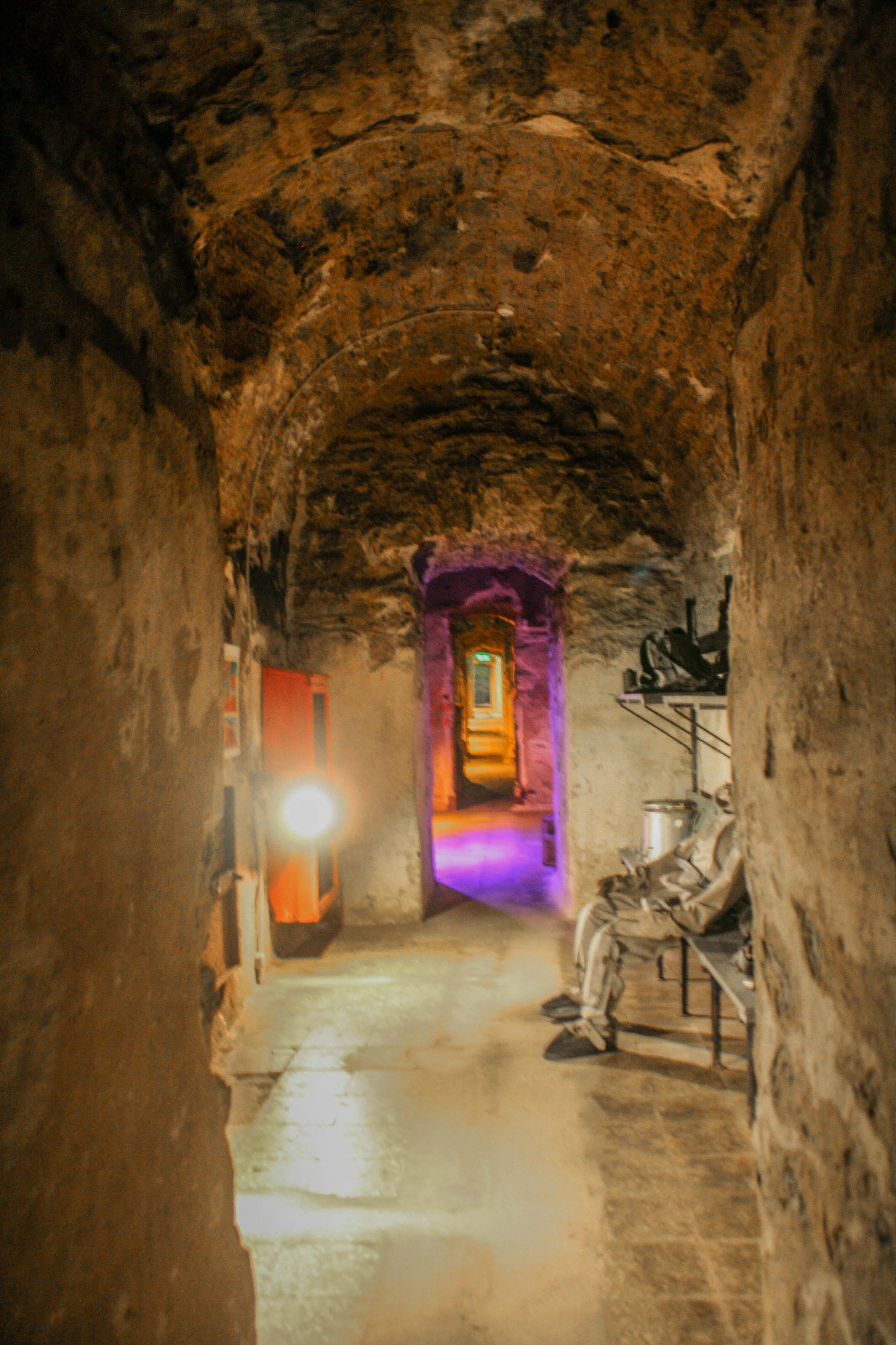 As we descended below ground and entered the tunnels, the drop in temperature was shocking. I could only imagine what it was like for the prisoners of war who were held here during military engagements. Narrow stone passageways and arches led from chamber to chamber, occasionally branching off to the sides down unlit corridors. I could tell how sturdily these tunnels had been constructed—ideal for their unintended use as air-raid shelters during World War I and bomb shelters during World War II. During the Cold War, electricity, ventilation, water, and phone systems were installed, preparing the space in the event of a nuclear strike for, well, not everybody—just the rich.