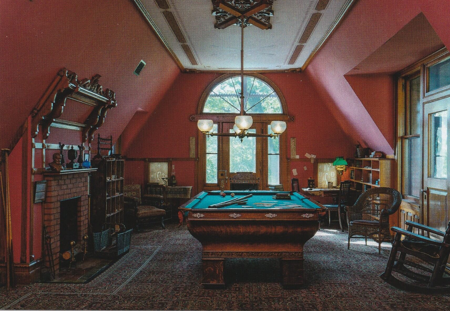 The tour continued to the two upper floors, to the Clemens Bedroom, with its ornately carved bed purchased in Venice (Twain would die in this bed in a different home, in 1910 at age 74); the Nursery; the School Room, where the Clemens girls were homeschooled in German, history, arithmetic, and geography, among other subjects; and the Billiard Room, which functioned as Twain’s office, study, and private entertainment space. Away from the activity of the busy household below, this room and its relative quiet enabled Twain both to write his greatest works—The Adventures of Tom Sawyer, The Prince and the Pauper, Adventures of Huckleberry Finn, and A Connecticut Yankee in King Arthur’s Court—and to entertain friends, sometimes into the early-morning hours, with billiards, cigars, and hot Scotch.
