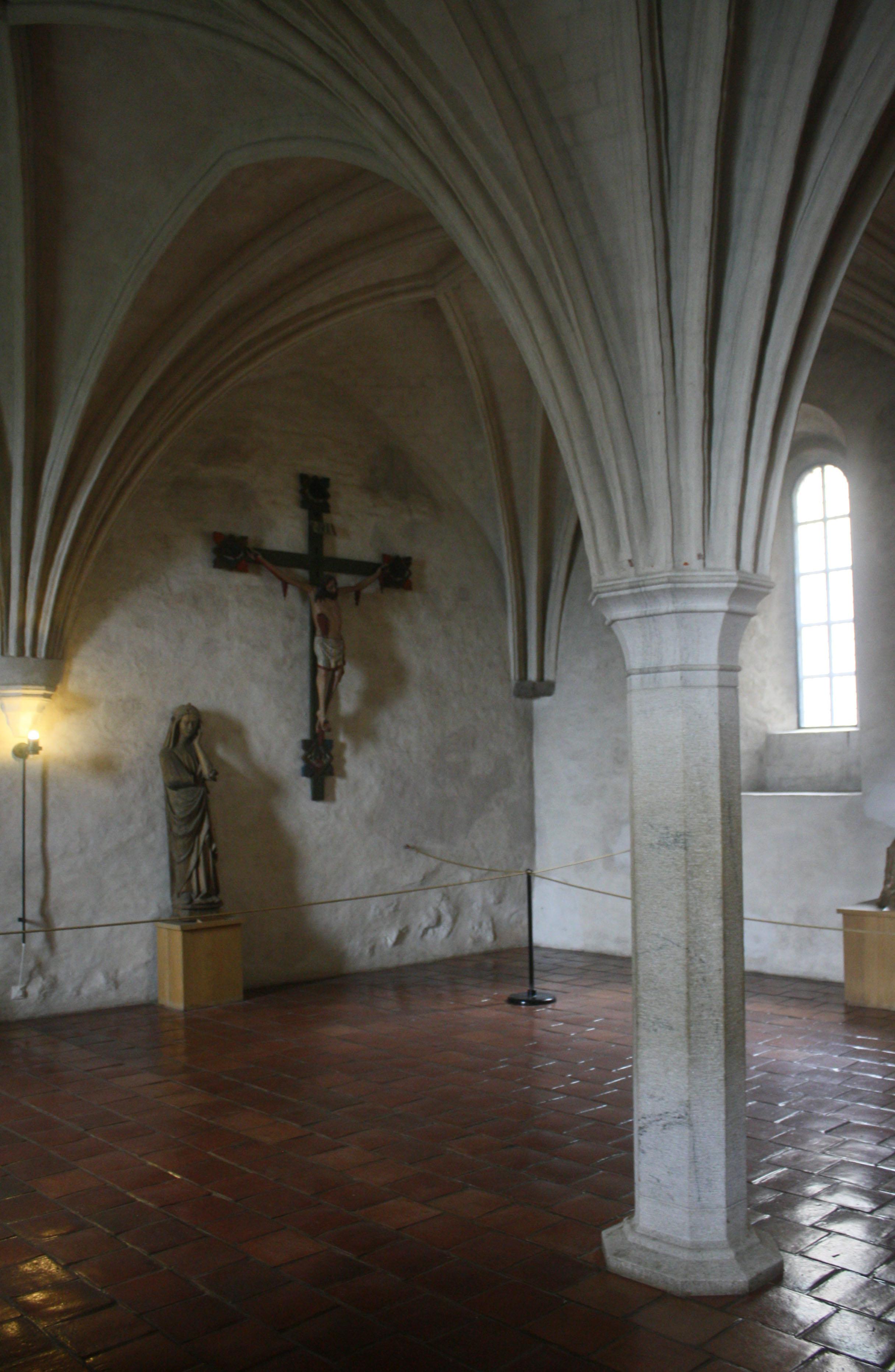 Throughout the castle, I was continually surprised not only by the building itself, but its contents as well. The Nun’s Chapel, for instance, features a single column in the center of the room, supporting a wonderful groin vault ceiling, and holds an exceptional collection of medieval wooden religious statues, including an extremely curious Crucifix, with the blood pouring from Christ’s wounds resembling bunches of grapes. The long King’s Hall, from the 1550s, boasts an impressive wood ceiling and centuries’-old tapestries. The church has a small railed altar, rows of box pews painted a faded cerulean blue, and a pulpit with a panel for each of the four evangelists.