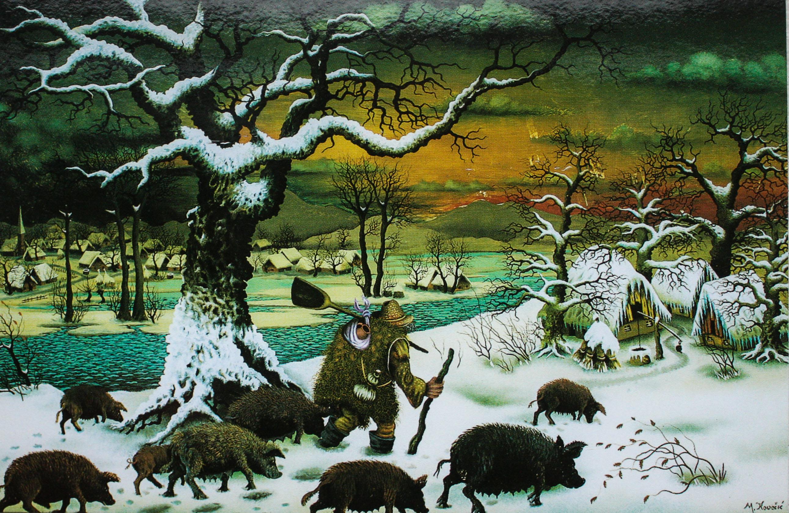 These artists are not merely weekend hobbyists. They are accomplished craftsmen and craftswomen, and in Croatia their tradition reaches back at least to 1931, when their works were first showcased in an exhibition in which they strove to prove that the upper classes in urban areas did not hold a monopoly on talent and that the creation of art was not restricted to those with proper schooling and a degree. These artists were ordinary Croatians—rural peasants, shopkeepers, clerks, and farmers who often portrayed agrestic landscapes. Later on, the form expanded when idealized countrysides, portraits, architectural panoramas, and darker themes began to emerge, joining the rural realism of earlier works.