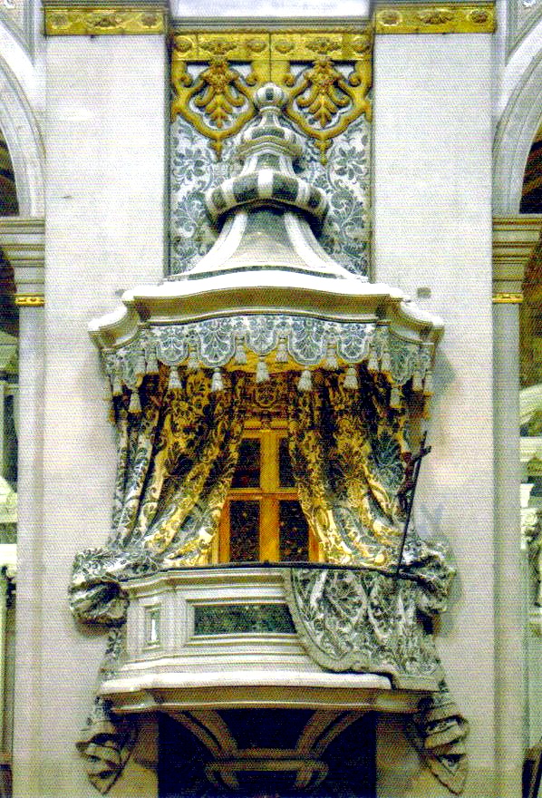 With only one window on the façade and buildings pressed against either side of the church, I was expecting the interior to be dark and, despite the imposing front, somewhat small. Upon entering, I was delightfully surprised by its grandiosity and brightness as well as the overwhelming but harmonious ornamentation. I was lured directly forward, past the side chapels and under the complicated stucco ceiling, to the arresting high altar—a tabernacle covered by lapis lazuli, a globe sculpture with the Father and Son watching over it, and ten corkscrew columns of green marble supporting a huge baldachin.