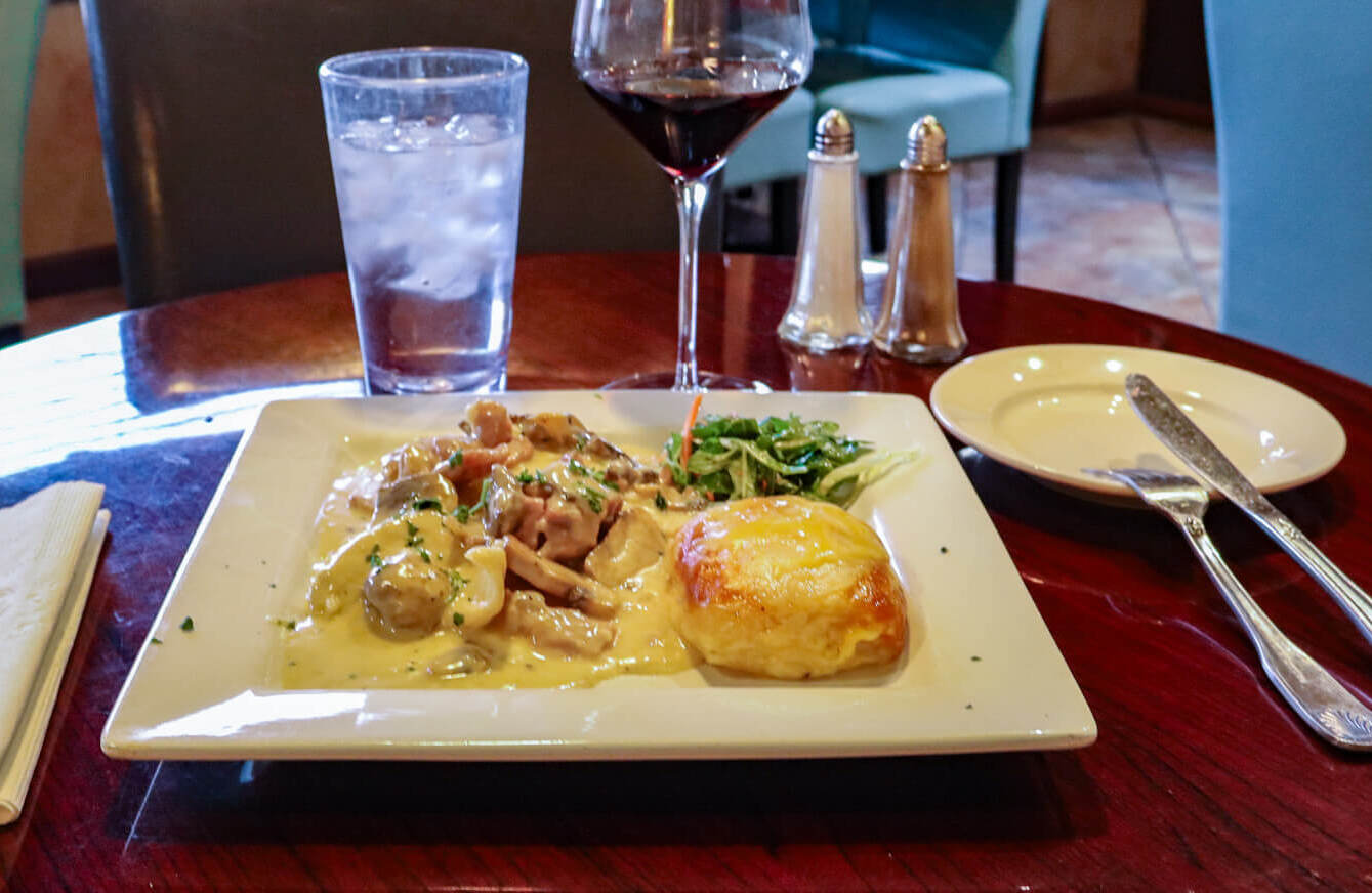Try This: I wasn’t aware that Arizona produced wine, so I chose to sample a local touch of the grape, like the Arizona Stronghold Nachise red wine. Begin your meal with the Italian risotto balls with mozzarella and peas, served in pool of marinara sauce and topped with shavings of parmesan cheese. Then select the Pollo Nirvana—chicken breast stuffed with prosciutto and fontina, and topped with mushrooms and a mustard sauce. It comes with au gratin potatoes as well as a side salad with grape tomatoes, cucumbers, carrots, and Italian dressing.