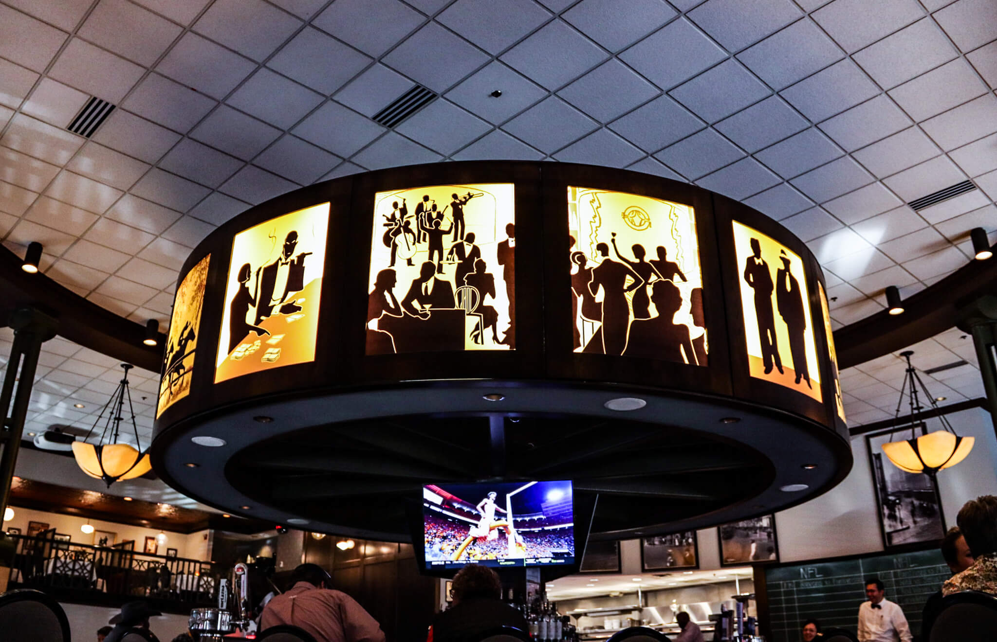 I perched myself at a circular high-top table in Harry & Izzy’s, a double-level restaurant in the core of downtown Indianapolis, Indiana. I glanced at the upper level, at the multiple seating areas with tin ceilings and interior windows that looked down at the street-level dining areas. The popular circular bar in the middle is embellished with illuminated panels with Jazz Age–style figures. Named for partners and longtime friends optometrist Harry Roth and bookie Izzy Rosen, the whole place exudes class and sophistication, with dark woods, rich fabrics, and a deep color palette that conjures up a subtle speakeasy vibe.