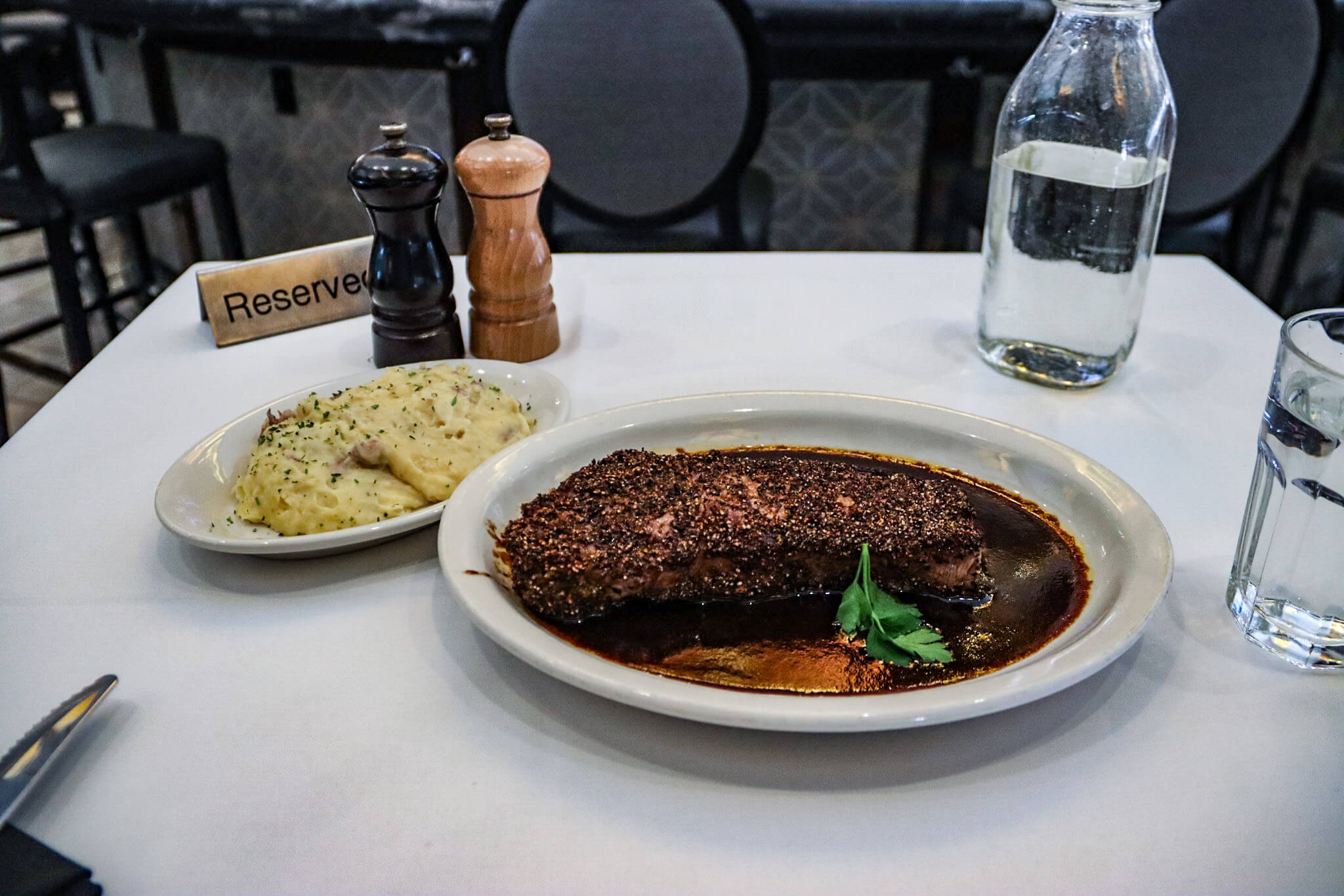 Try This: Start with a salad of mixed greens with English cucumbers, grape tomatoes, aged cheddar cheese, peppered bacon, seasoned croutons, and avocados with a cilantro-lime vinaigrette. For your main course, focus on the offerings of steaks—100% Black Angus beef from cows raised in the upper Midwest with cuts aged for an average of 45 days. I chose the New York strip steak rolled in cracked pepper and pan-seared, with an orange brandy butter sauce and alongside the creamiest mashed potatoes imaginable. Don’t resist dessert, particularly the peanut butter pie with brownie crumb crust and topped with peanut butter glaze.