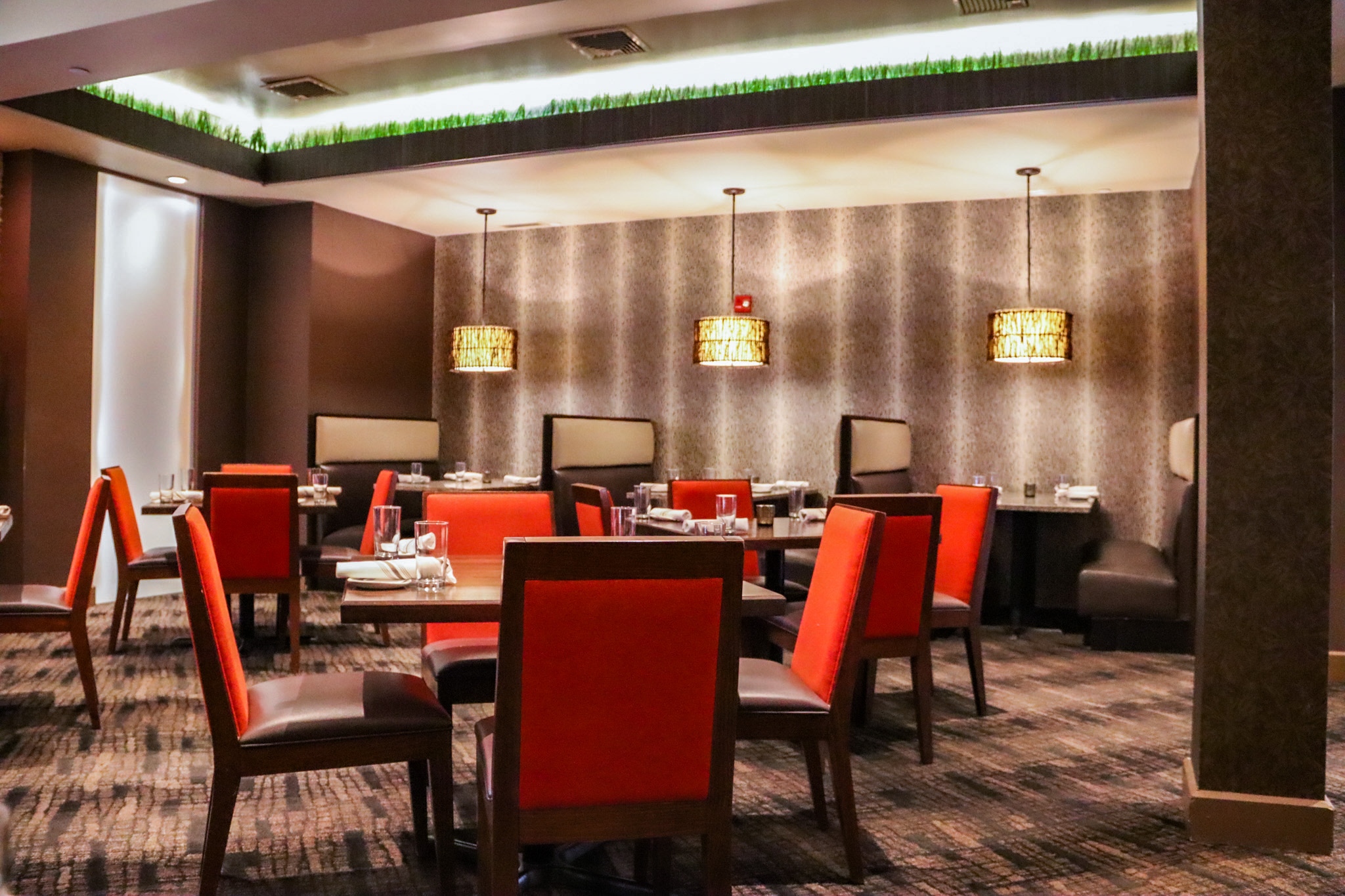 slid into a high-backed booth inside Mesh, a two-floor restaurant with an upscale setting. The brick walls and textured wallpaper, the quartz tabletops, the red-back chairs, and the protruding shelf on the upper walls, filled with green grass that conjures up, perhaps, fields where the locally sourced animals would graze, convey a thoughtful refinement. It’s the kind of place where you’d be comfortable no matter who you’d be dining with: a date, a client, a couple of friends, your weekend brunch crowd. With polished service and a unique menu, you’re guaranteed to be complemented on your choice by your dining companions.
