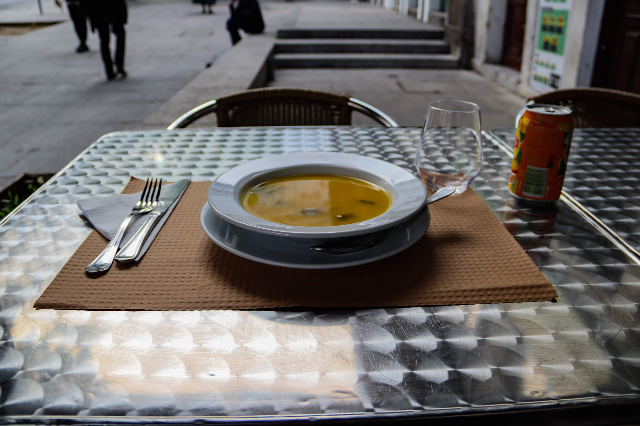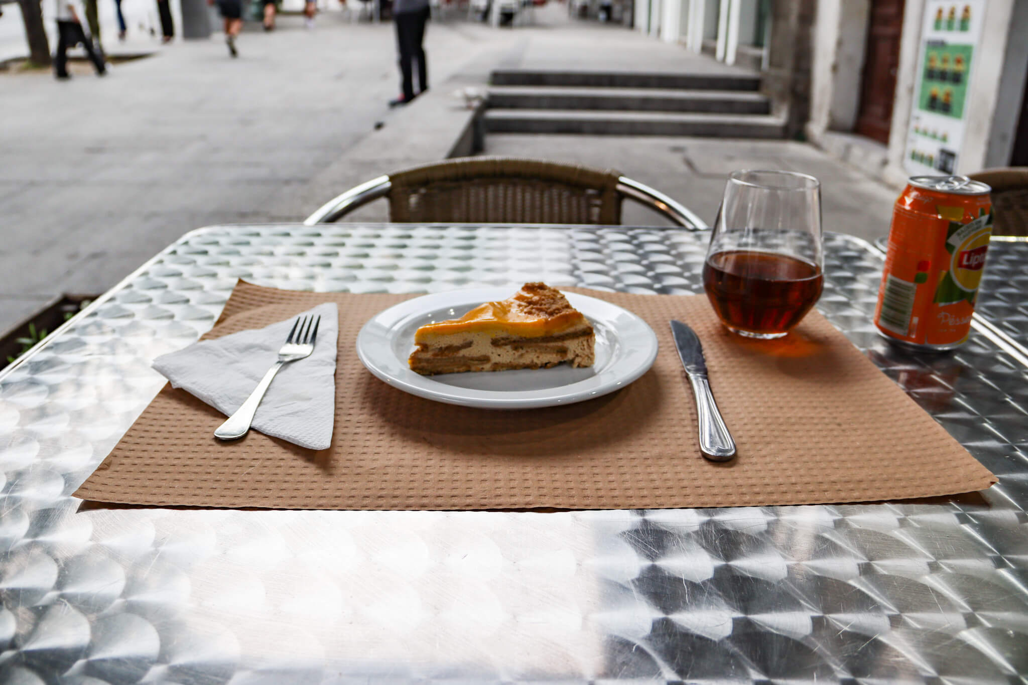 Try This: Spring evenings in Porto tend to run comfortably cool, so if you do choose to dine outside, start off with the soothing vegetable soup. Although the name O Marinheiro translates to “the sailor” (look for the anchor and nautical rope logo here and there) and the restaurant offers a dozen different items from the sea, I counterintuitively chose the wonderful pork medallions topped with grilled pineapples. It’s served with flavorful potato crisps and a mixed salad of lettuce, tomatoes, cucumbers, carrots, and olives. For dessert, sample a Portuguese favorite, bolo de bolacha e caramelo, a delicious wafer cake topped with caramel.