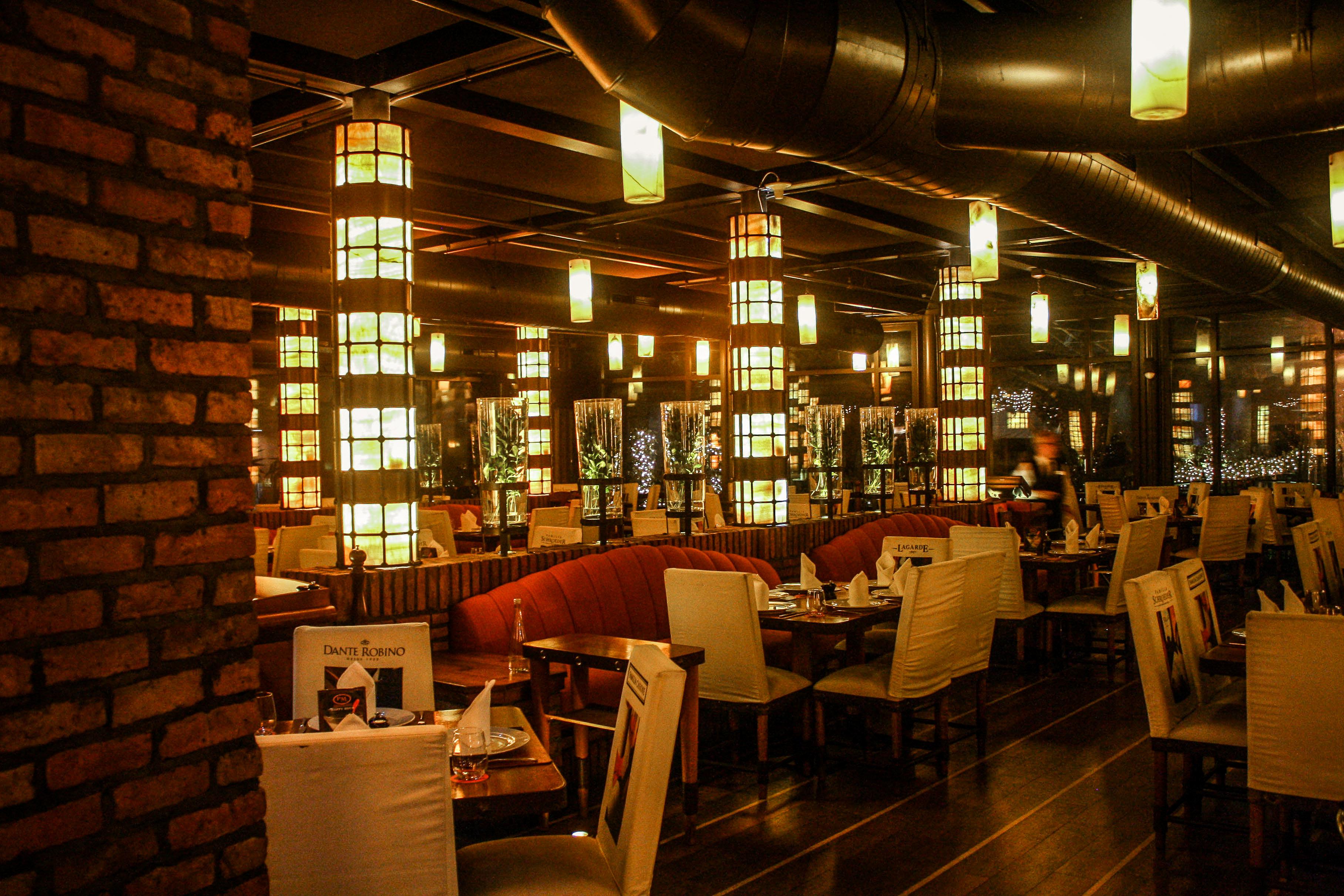 The evening was a bit too chilly to sit out on the romantic terrace, so the host led me into the tremendous byzantine interior that can best be described as industrial chic: wood floors, an iron spiral staircase leading up to a catwalk and second-floor seating, a curved bar with an alabaster top. Yellow light fixtures circling the entire height of supportive columns and lanterns hanging from the high ceiling cast a warm glow throughout, and background Latin music plays just loud enough to enjoy without having to scream to your tablemates. Enlarged photos of the gritty manufacturing sections of the Puerto Madero barrio in Buenos Aires (hence the “PM”) adorn the brick walls and provide yet another visual engagement as you await your meal, served at an appropriately relaxed pace by the polished raven-haired wait staff—all male, all Latino (not a blond in sight), and most probably doing some modeling on the side.