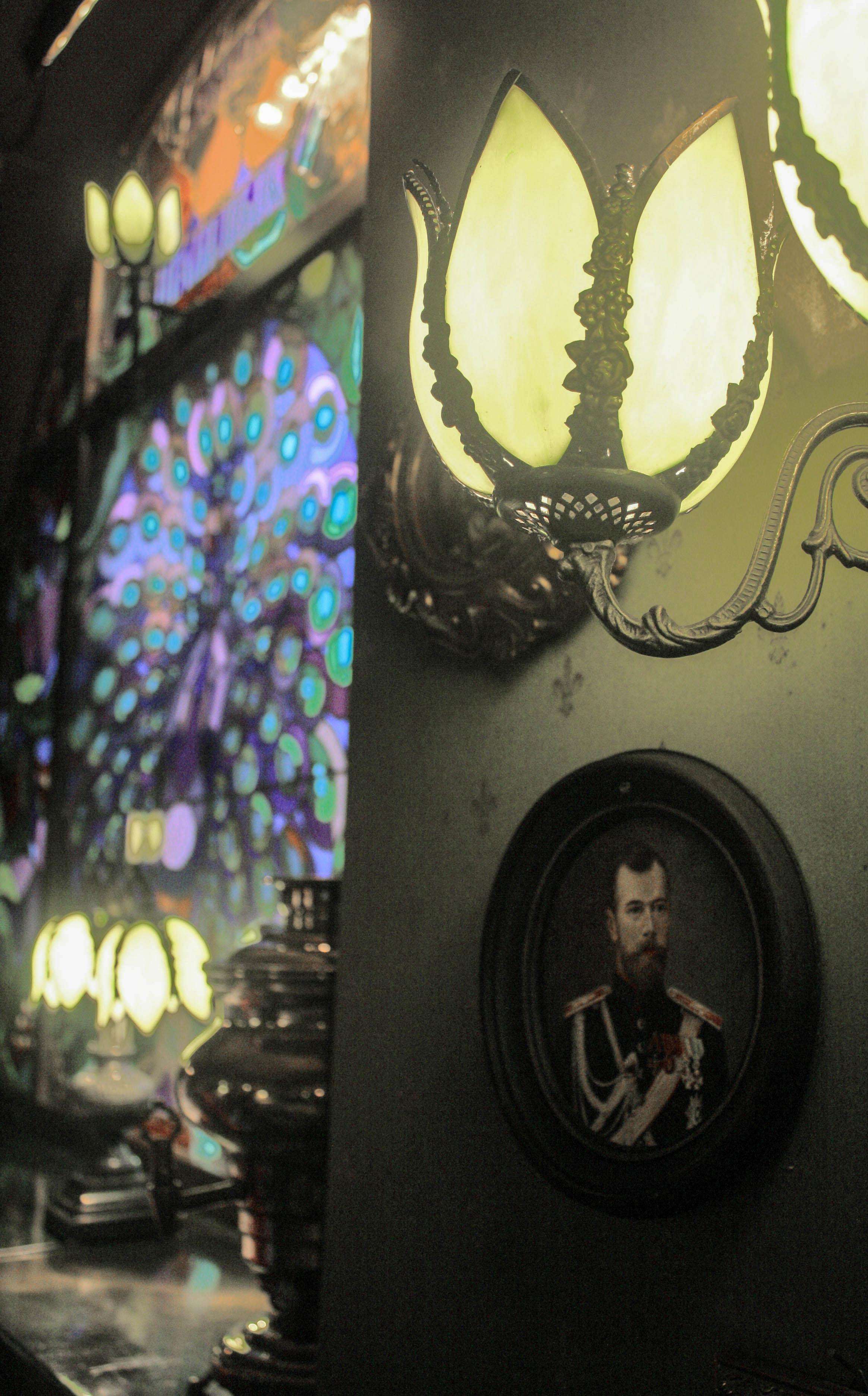In business since 1972, Šašlik is a throwback to imperial Russia, and I almost expected to see a czar and czarina walk by at any moment. Surrounded by small samovars, heavy drapes and gold trim, stained glass, wood wainscoting, green fleur-de-lis wallpaper, paintings of Russian landscapes and hunting scenes and autocratic czars, particularly the ill-fated Nicholas II, and waiters in red blouses with embroidery and epaulets, there was no mistaking that Russia ruled here for a century, and that you’re about to have an authentic dining experience.