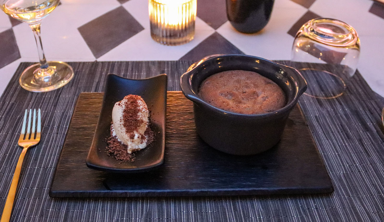 For dinner, however, I migrated outside to the patio with a white and dark gray Q*bert floor that matched the tabletops. Easy, jazzy New Age music set a slightly sultry mood, and I kept looking for a model to drop by at any moment. When my meal arrived, however, my gaze was laser-focused on the culinary creations before me.
