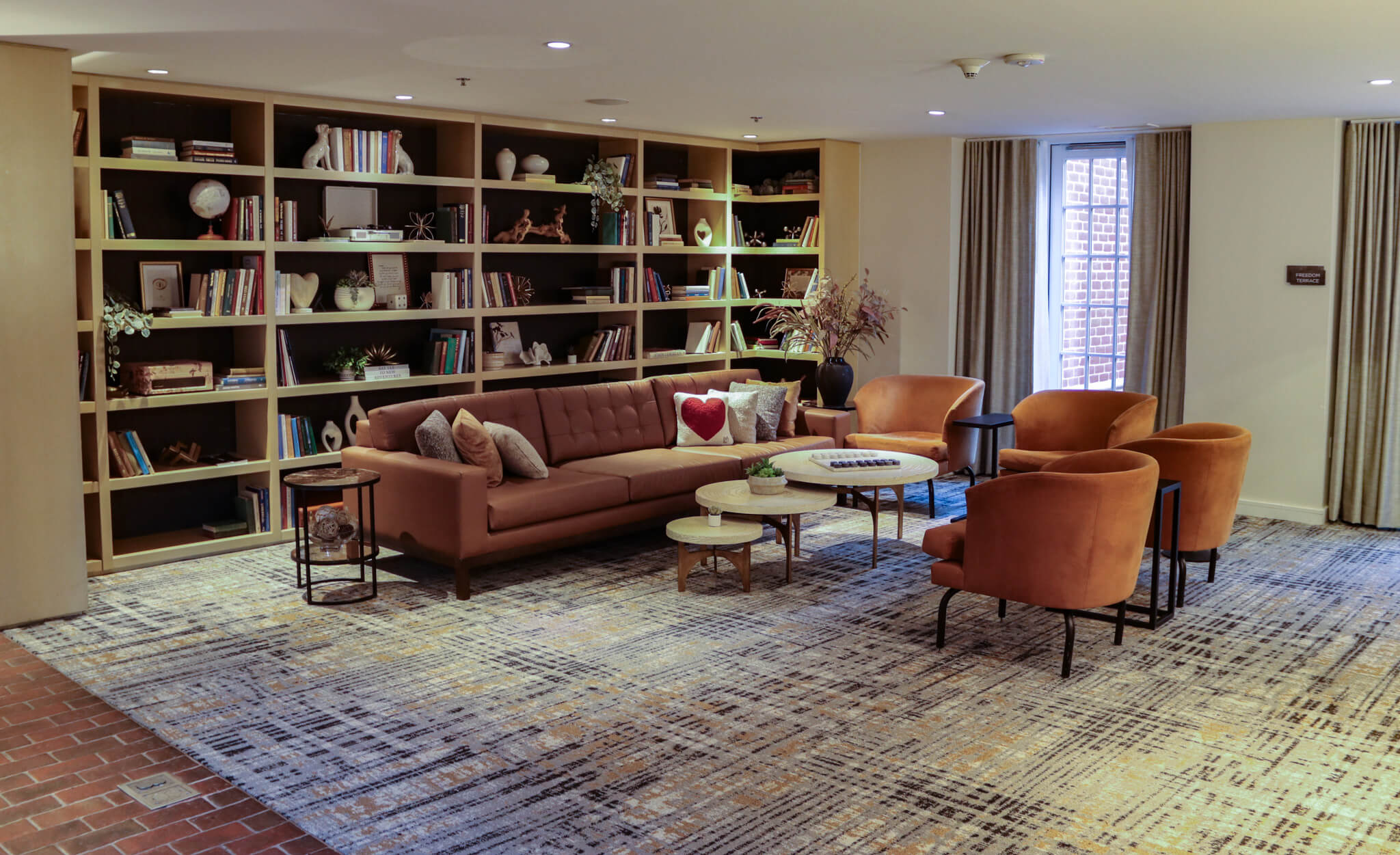 Built only in 2009, it fits seamlessly into the historic district, what with its brick façade, simple window lintels, and roofline cornice, dentils, and brackets. I passed through the brick-paved courtyard with a clock tower in a pool, surrounded by chairs, tables, and benches, and entered the lobby, where the brick continues, complemented by slate squares.