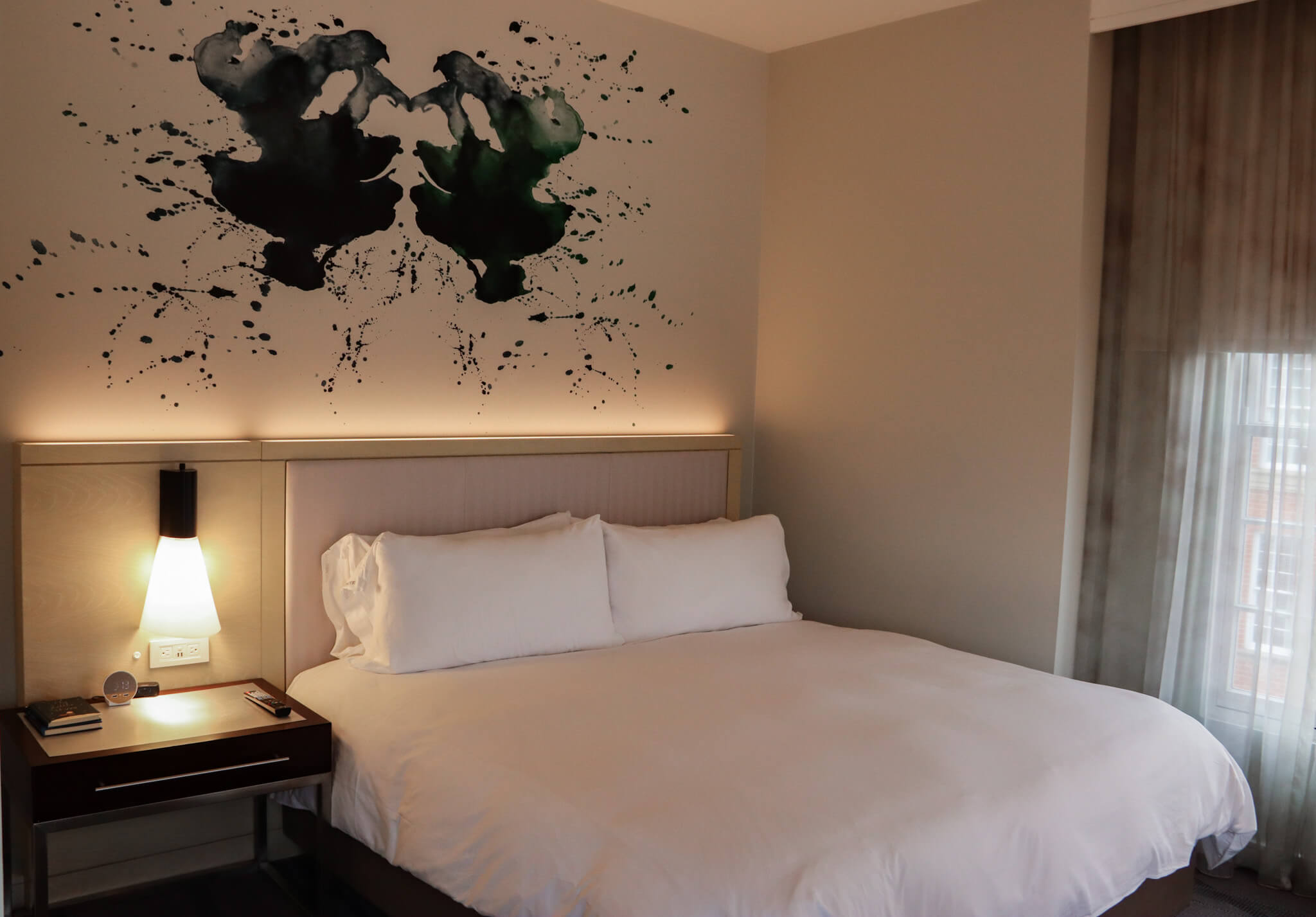 My king-size bed was so comfortable that I inadvertently missed a few innings of every game of the 2025 World Series on the 42” HDTV. Above the bed, the hotel’s signature green and blue ombré art wallcovering looks like a Rorschach test that can keep your imagination running. Bedside tables, a work desk, and deep windowsills provide plenty of places to spread out your stuff, and an abundance of outlets enables you to charge all your devices simultaneously.