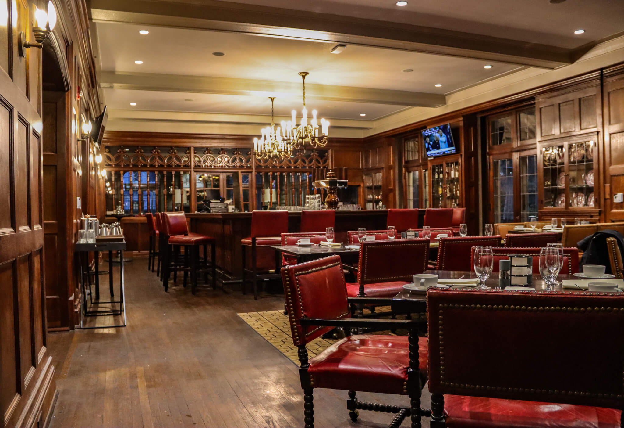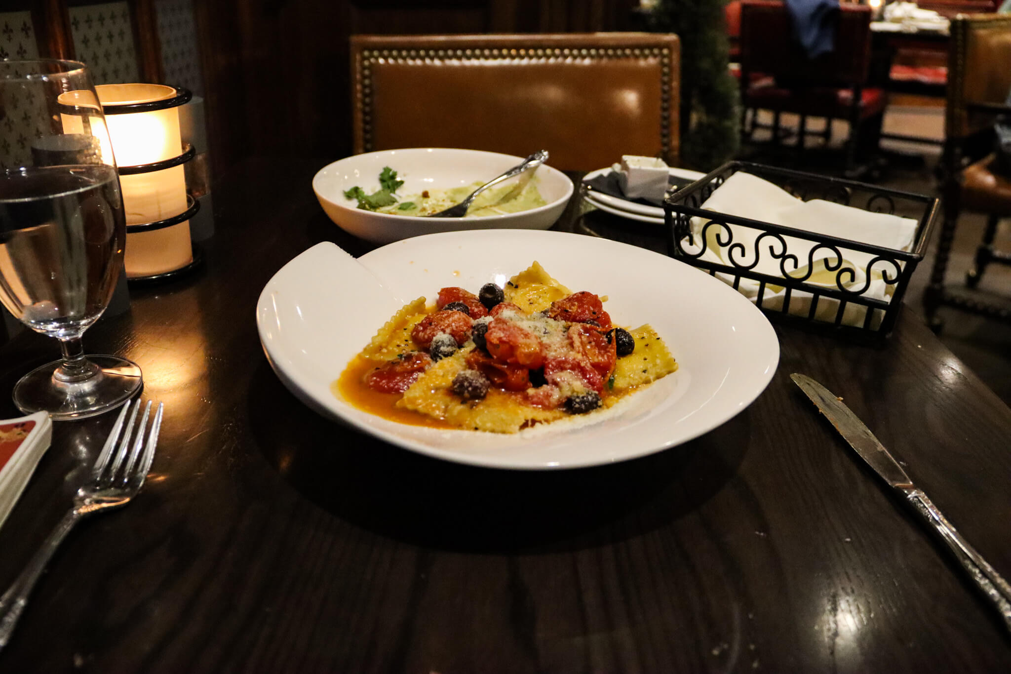 On the lower level, rooms for banquets, weddings, and meetings welcome large groups, and there’s a small library as well. A separate carriage house is the perfect venue for an elegant affair and opens to a courtyard kept private by a high stone wall. On the main level of the main building, The Tavern invites you to dinner in a wonderful setting. Four arched entrances open up to the dining room’s burnished metal chandeliers, red leather seats, fireplace, carved oak walls, friendly central bar, fleur-de-lis designs in the glass panels of the French doors, and a raised semicircular alcove with bow windows. Here, you can enjoy a dinner of, for example, lamb empanadas with cotija cheese and aji verde sauce for an appetizer, followed by lemon-ricotta ravioli with roasted cherry tomatoes, niçoise olives, oregano, basil, and parmesan.