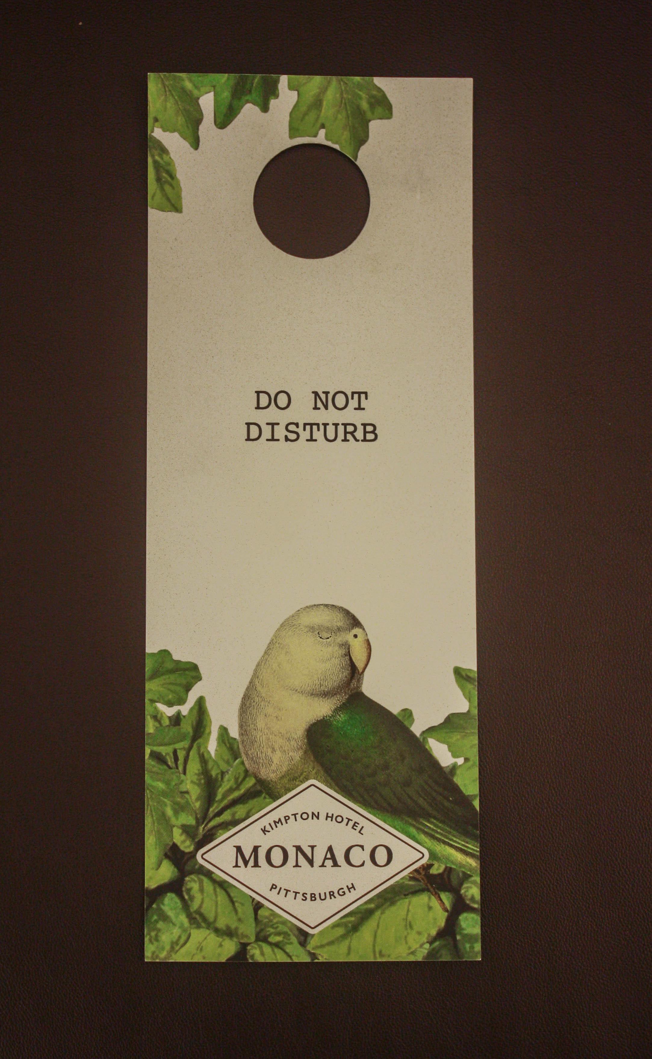 I wasn’t paying too much attention to the disquisition of amenities and services being conveyed to me by the lady at the front desk when I checked into Pittsburgh’s Hotel Monaco after 10 hours on an Amtrak train from New York, but it sounded dreamily pleasant. All I really wanted was to stumble up to my room and crawl into bed, postponing the processing of all that information for the following day. As I lied down in my large, comfortable bed with the oversized kelly-green headboard, I briefly pondered the bright yellow birdcage enclosing the chandelier over the end table next to me. What an odd accent, I thought, as I drifted off to sleep in my virtually soundproof room. I wonder what that’s about?