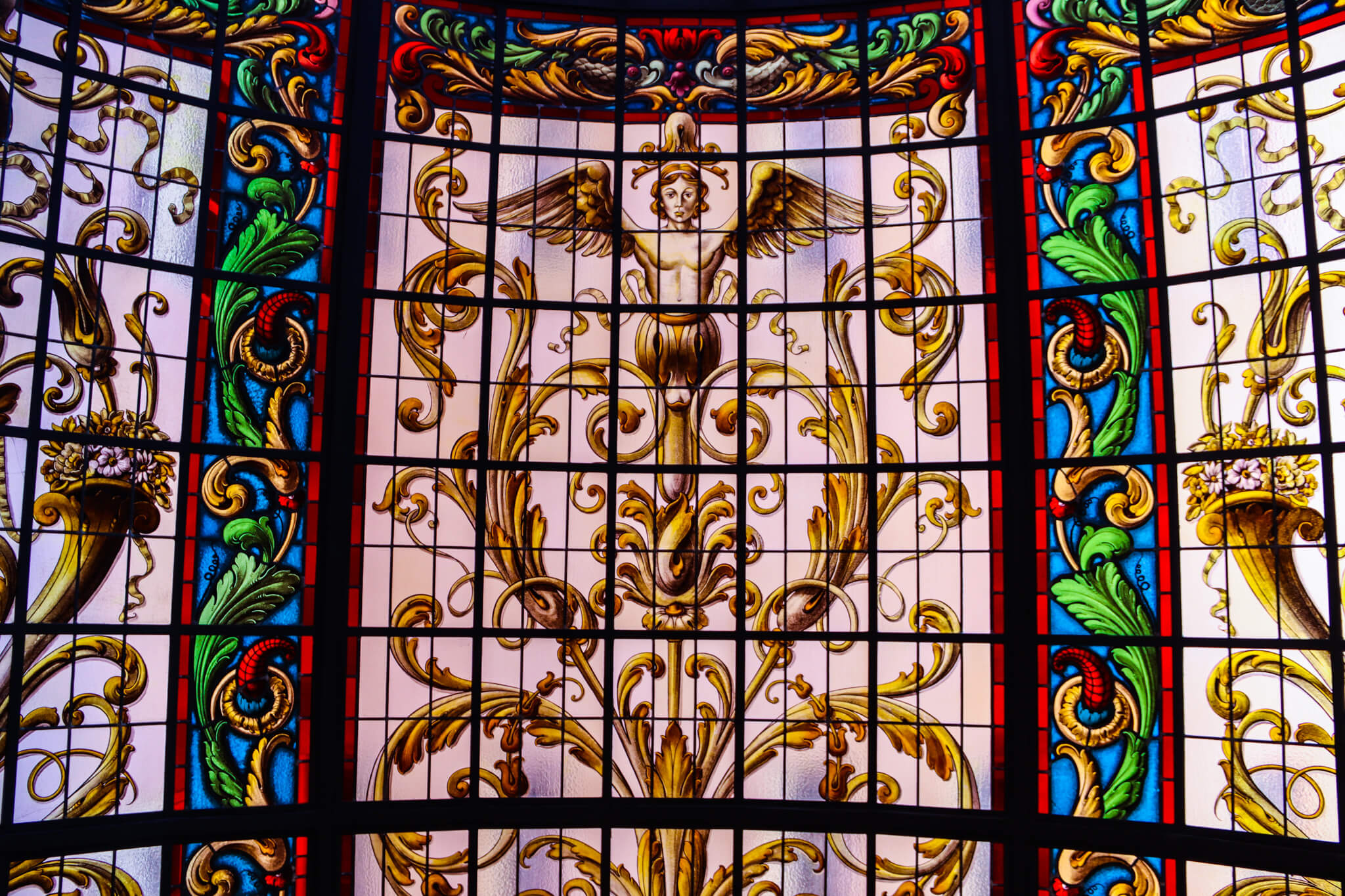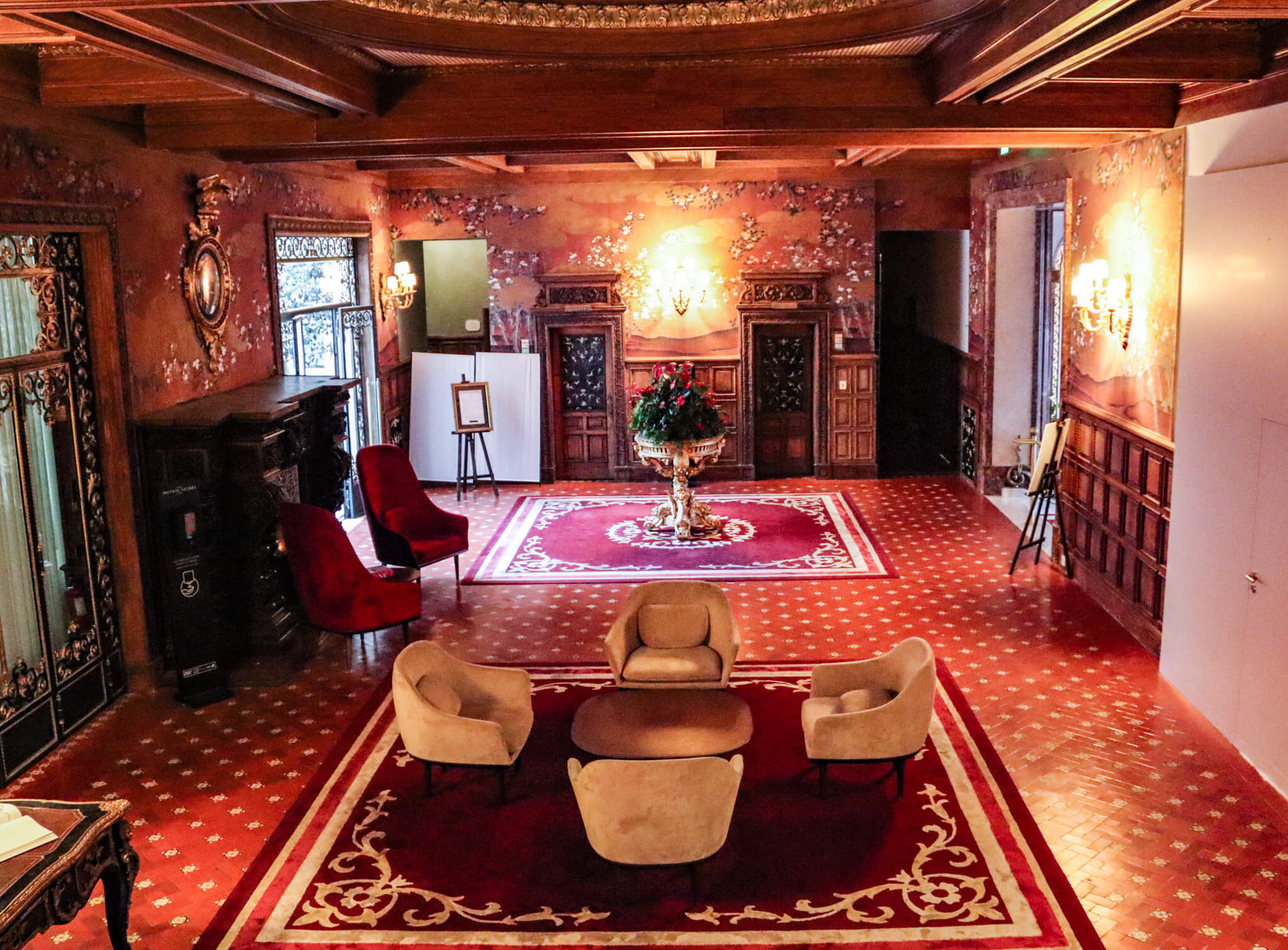 The main lobby is a paradigm of timeless elegance, a sumptuous display of plush carpets, antique furniture, silk wallpaper, wood paneling, crystal chandeliers, coffered ceilings, and a handsome fireplace. The twisting staircase with wrought-iron banisters features a beautiful three-story curved stained-glass panel. It leads up to another public space on the next floor, where comfortable seating invites you to sit for a bit in a quieter space, and the wrought-iron railings around the oculus in the floor grants views of the lobby and activity below. An even more quiet space could be found one more story up—the outdoor terrace with a plunge pool, umbrellas and lounge chaises that induce instant napping, and glazed ceramic urns.