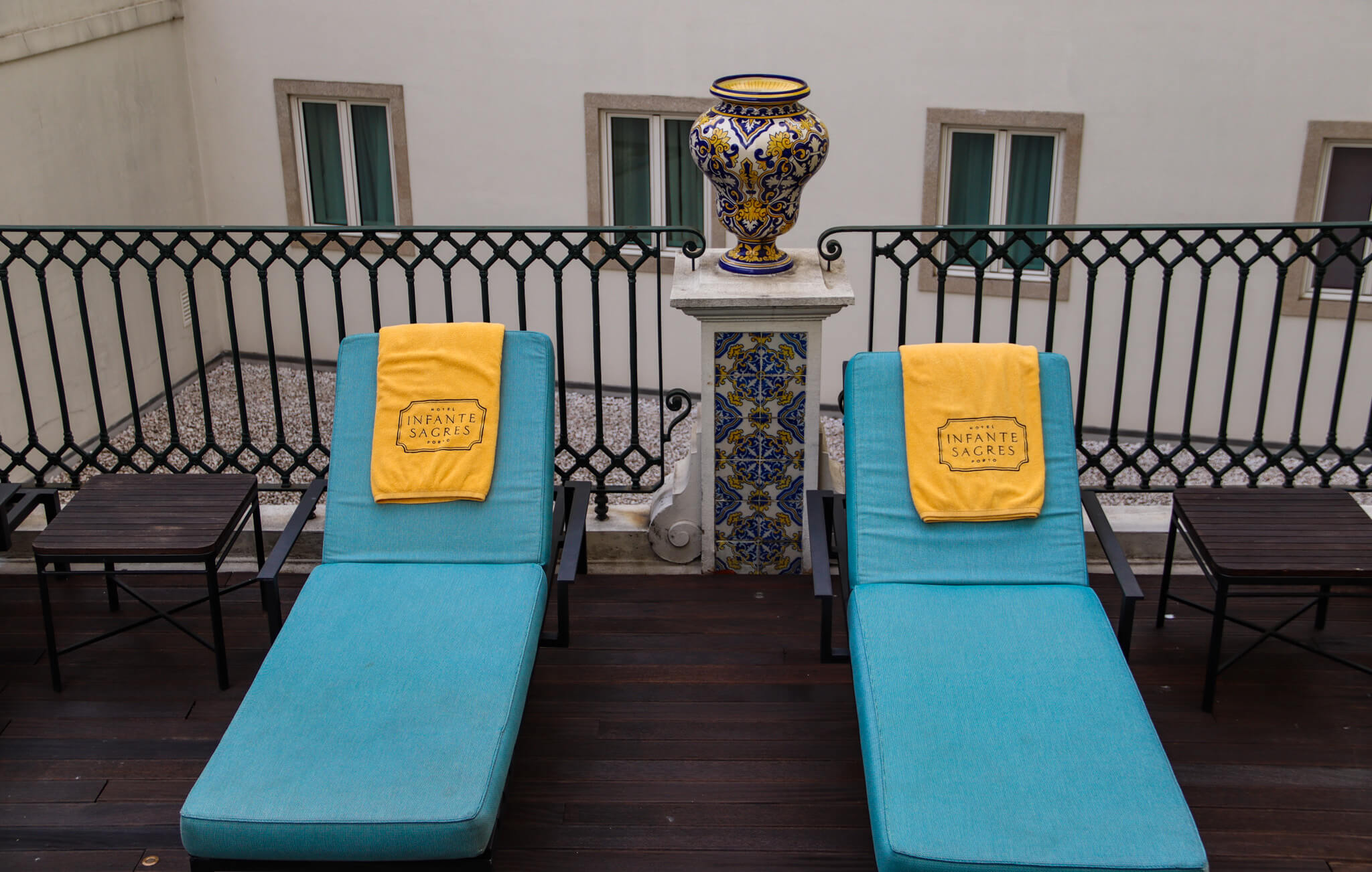 The taxi stopped at my destination in a busy square, with multiple bus lines running through it, nearly a dozen bustling restaurants, and a tunnel right in the middle that swallows up vehicular traffic and ejects them God knows where. I emerged from the taxi, paid the meager fare, and looked up at the pale salmon façade of the six-story Infante Sagres, with a fine bracketed cornice and a single balconet on each of the four upper floors. It resembled a grand 19th-century manor house, with very little ornamentation. I wondered if the activity all around me would filter in, disturbing some peaceful slumber I was craving after spending the last week climbing mountains and countless staircases and urban hills in and around Lisbon.