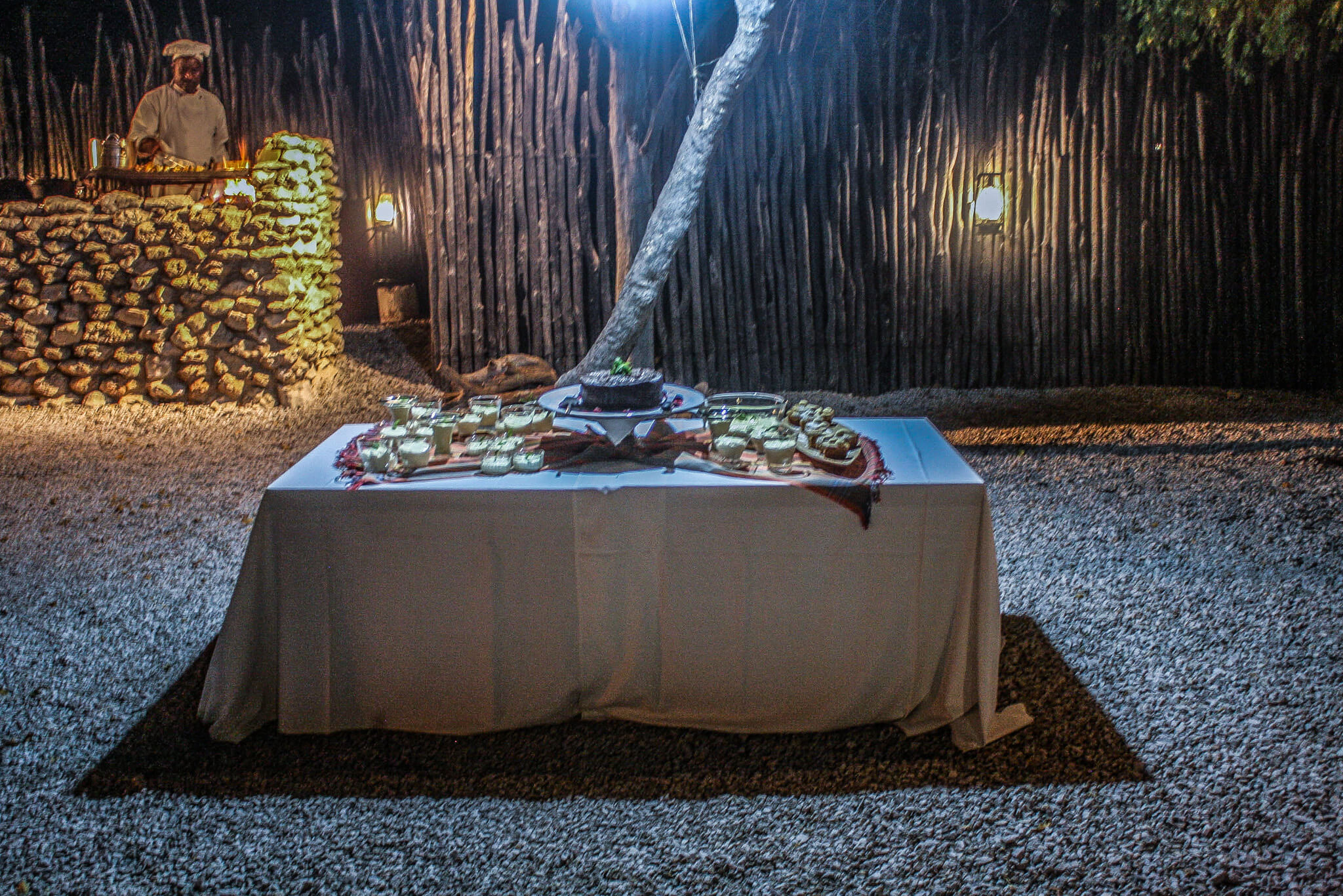 After settling in, I made my way to dinner, which would be served al fresco this evening. Tables and chairs had been arranged around an open firepit that provided some warmth. Chefs were busy behind stone-walled grills, and tables were laden with a wide variety of tempting food for tonight’s feast. Mushara has its own garden and incorporates many of its home-grown fruits, herbs, and vegetables into its meals. And all of it is delectable: tomato soup with croutons; spinach salad with hard-boiled eggs, cucumbers, feta cheese, and tomatoes; grilled eland; potatoes and cauliflower; chicken kebobs; roasted kudu; mielie pap (a millet porridge, a traditional staple food of southern Africa); chocolate-berry-banana cake; lemon mousse; and apple cupcakes, all accompanied by a couple of glasses of red wine.