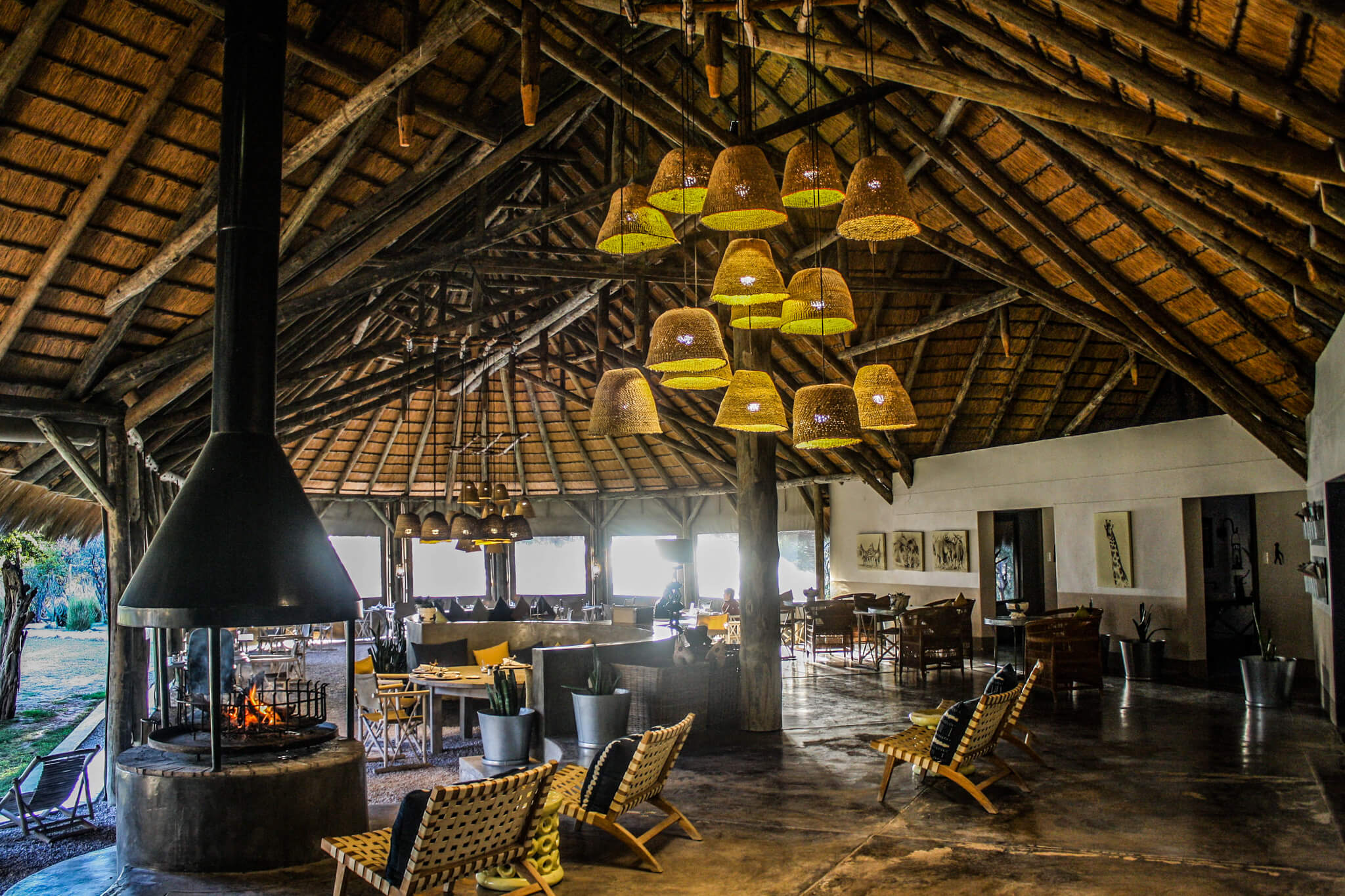 Lulled into a delightful postprandial sleepiness, I shifted over to a chair beside the circular fireplace, appreciating the intricate construction of the wood and thatched roof, and admiring the chandeliers, clusters of hand-woven upside-down baskets. It was a perfect way to ease into the night as I tried to recall all the animals I had seen over the past two days—not an easy task, but an utterly delightful one, performed in an unforgettable setting.