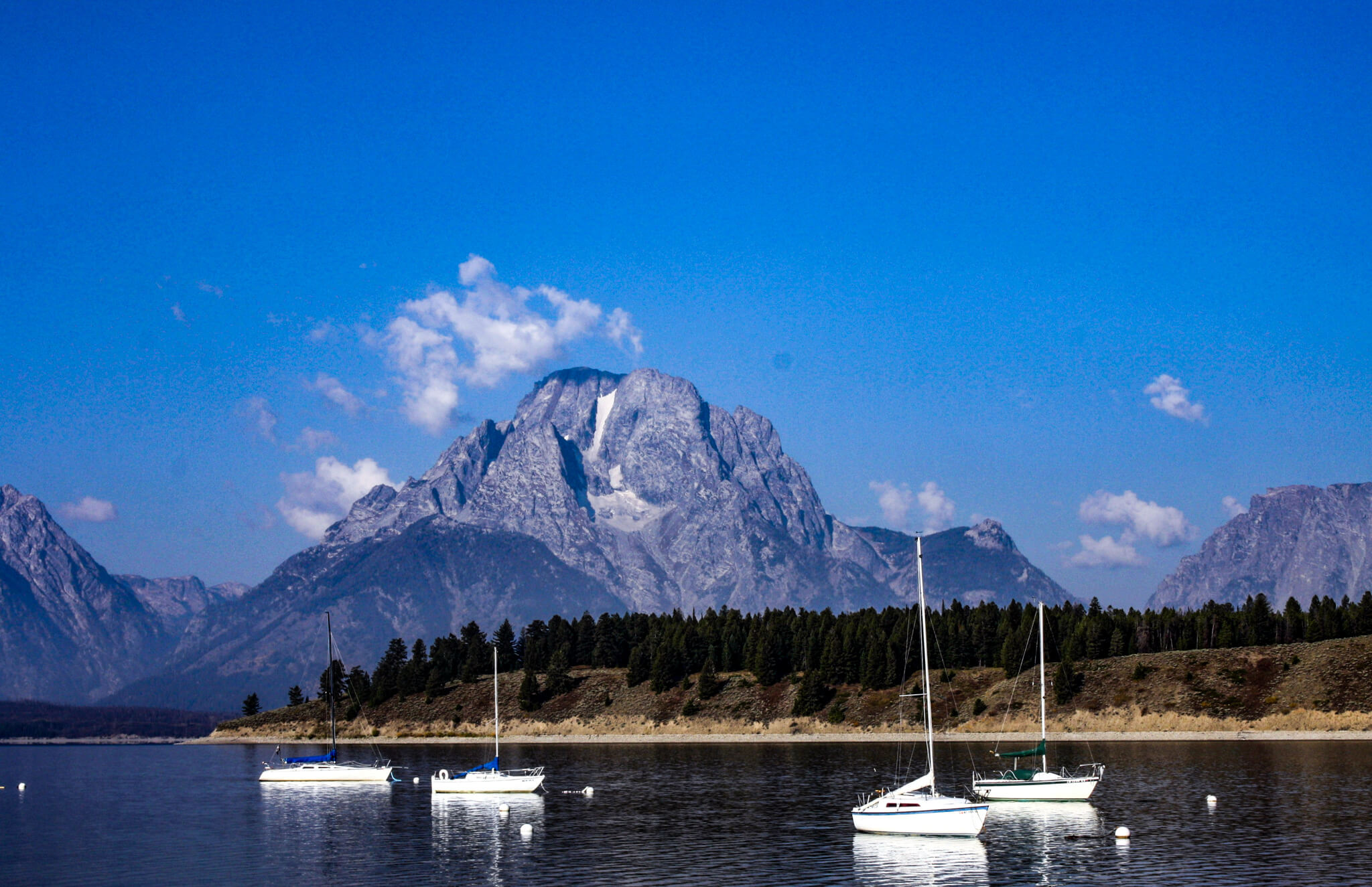 Scattered along the shore of Jackson Lake, the campgrounds and cabins of Signal Mountain Lodge take full advantage of their setting. The lodge also runs a marina, from which you can explore the lake, float down the Snake River, or do some fishing. Across the water, the serrated northern peaks of the Teton Range saw into the unobscured sky, especially Mt. Moran. Named for western frontier landscape artist Thomas Moran, this massive mountain rises more than 12,600’ above sea level and commands attention with its glaciers and gray face.