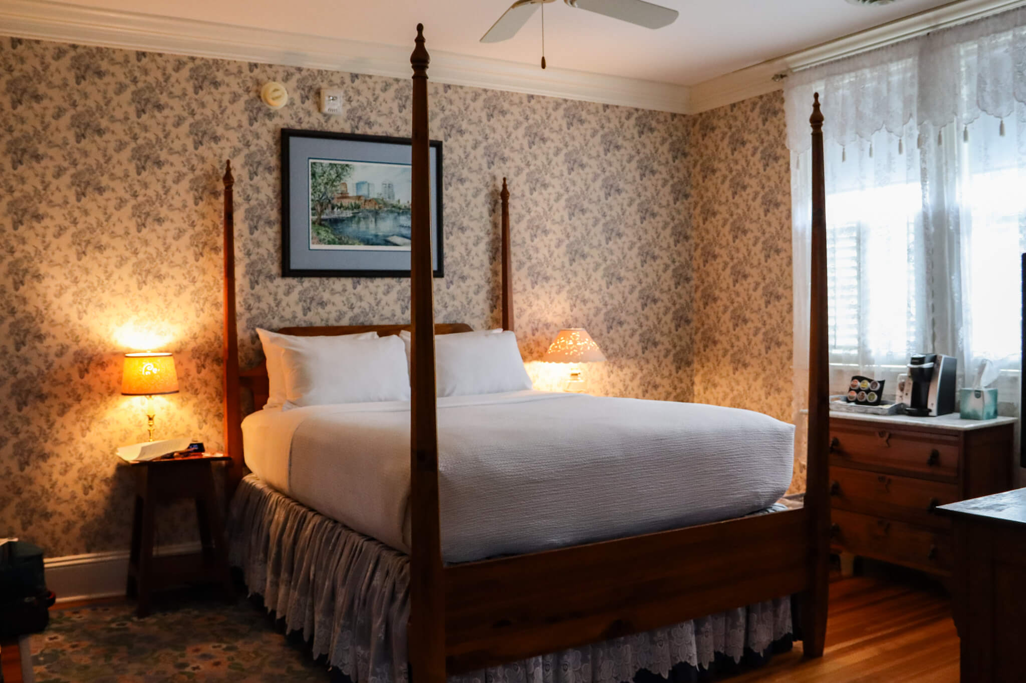 Upstairs, only four guest rooms keep the inn small-scale and intimate. I had opted for the Blue Room—a quiet oasis with north- and west-facing windows, a four-post queen-size bed, a pair of chairs, a couple of dressers, a writing desk and chair, Keurig coffee/tea maker, four lamps, a ceiling fan, and a spacious bathroom with impossibly fresh-smelling towels.