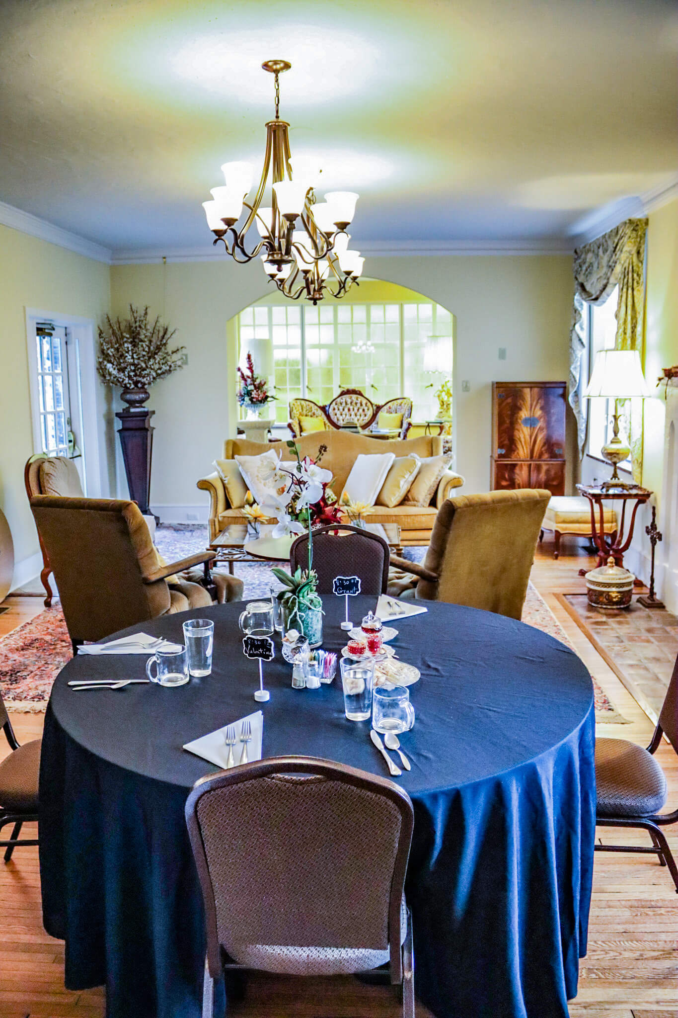 After exploring my short-term home, I headed outside, past the carriage house and through the parking area, to the Hull Mansion building. There, I found five additional guest suites, plus a library and a living room. The restored oak staircase leads up to a landing with a little sitting area and beautiful leaded glass. There are also a couple of rooms for breakfast. Large and small tables with assigned seating for your selected breakfast time encourage socializing with your fellow travelers, and you may very well make the acquaintances of, for instance, a retired Canadian couple driving down to Florida for the winter and a competitive season of pickleball, an environmental historian teaching at a college in the Northeast, and an Indian IT specialist from Chicago. Mini cinnamon rolls and banana nut muffins accompany your morning meal, which you get to select the night before. You may enjoy orange juice, sausage, coffee, and French toast with sourdough bread, cream cheese, and blueberry topping one morning, a spinach omelet with roasted potatoes, toast, and tea the next.