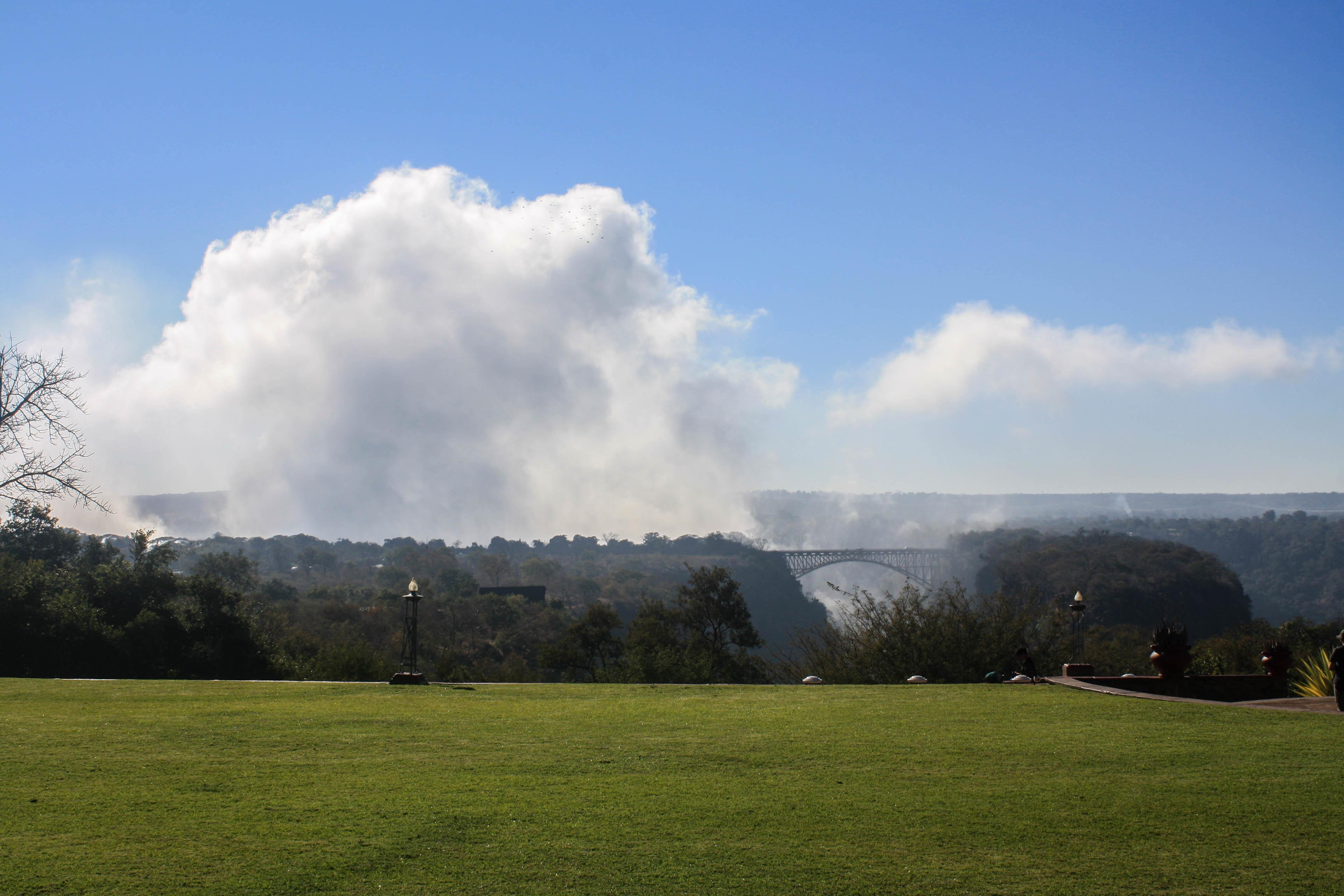 Outside, a pair of lily ponds in an inner courtyard offers a tranquil space. Lush gardens lead you to the large swimming pool, framed by pergolas and a beautiful cabana and anchored by a fountain, where you can do a few laps and then succumb to an afternoon nap or enjoy one of the hotel’s signature cocktails. Manicured lawns, often frequented by wandering warthogs, entice you to sit on a comfortable chair under a shade tree to enjoy one of the hotel’s defining characteristics: the view. Although you can’t see Victoria Falls—one of the world’s top five waterfalls—from the grounds, you know they’re there. The not-so-distant roar of “the smoke that thunders” as about 300,000 gallons of water drop over the edge per second reaches your ears, and the view of the Second Gorge and the 114-year-old Victoria Falls Bridge that connects Zimbabwe and Zambia beguiles you. The mist of the falls, so thick in the beginning of winter at the very end of the rainy season, appears to be a continually shifting cloud that changes minute by minute in shape and color as the day progresses. This mesmerizing vista is exactly one of the reasons why you should stay here.