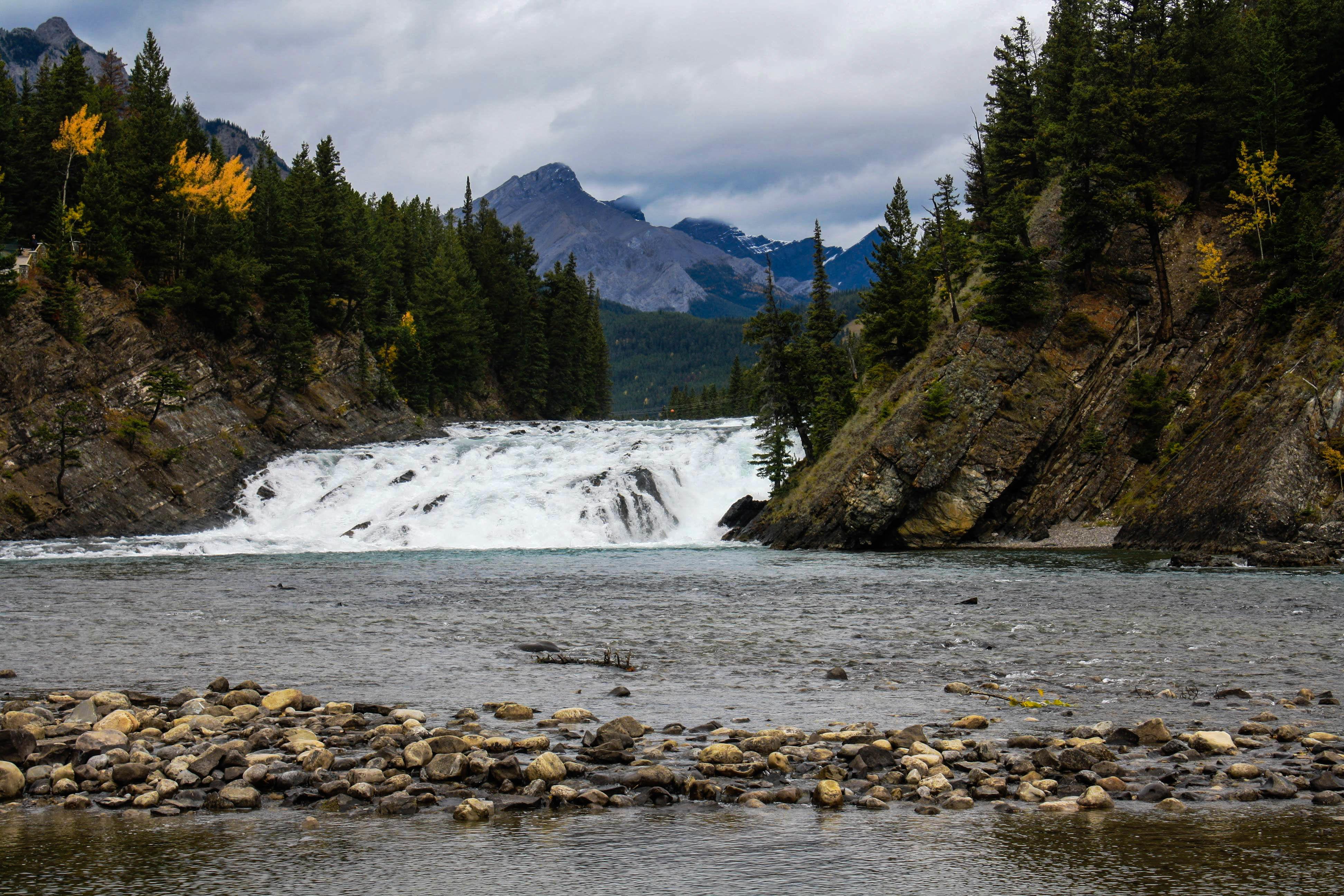At the confluence of the Bow and Spray rivers, the falls—small but powerful—attract a good number of visitors, thanks to its easy access and convenience. Only about 30′ high but 130′ wide, the falls tumble over rough bedrock, producing a dramatically turbulent hiccup in the Bow River in an otherwise utterly placid and memorable setting—the perfect place to sit for a while, unpack my backpack, and enjoy a picnic lunch, all practically within shouting distance of town.