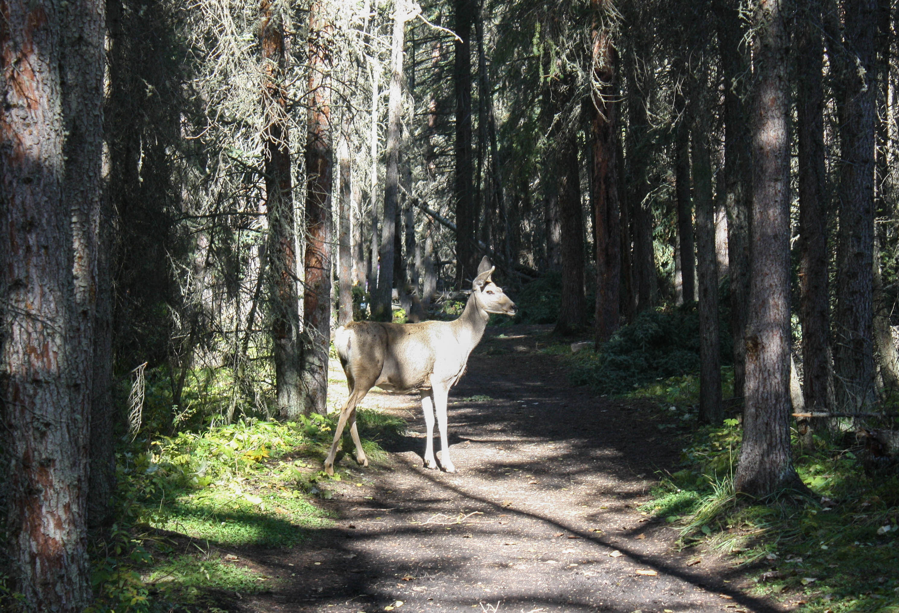 The northern part of the town abuts the twisty Bow River. I turned right onto the Bow River Trail, and only two minutes into my hike, a timid deer emerged from the trees onto the trail right ahead of me. We stared at each other motionless for a while—me in admiration, the deer in evaluation of my potential threat to its life—until a couple arriving from the opposite direction broke the silence and it loped off.