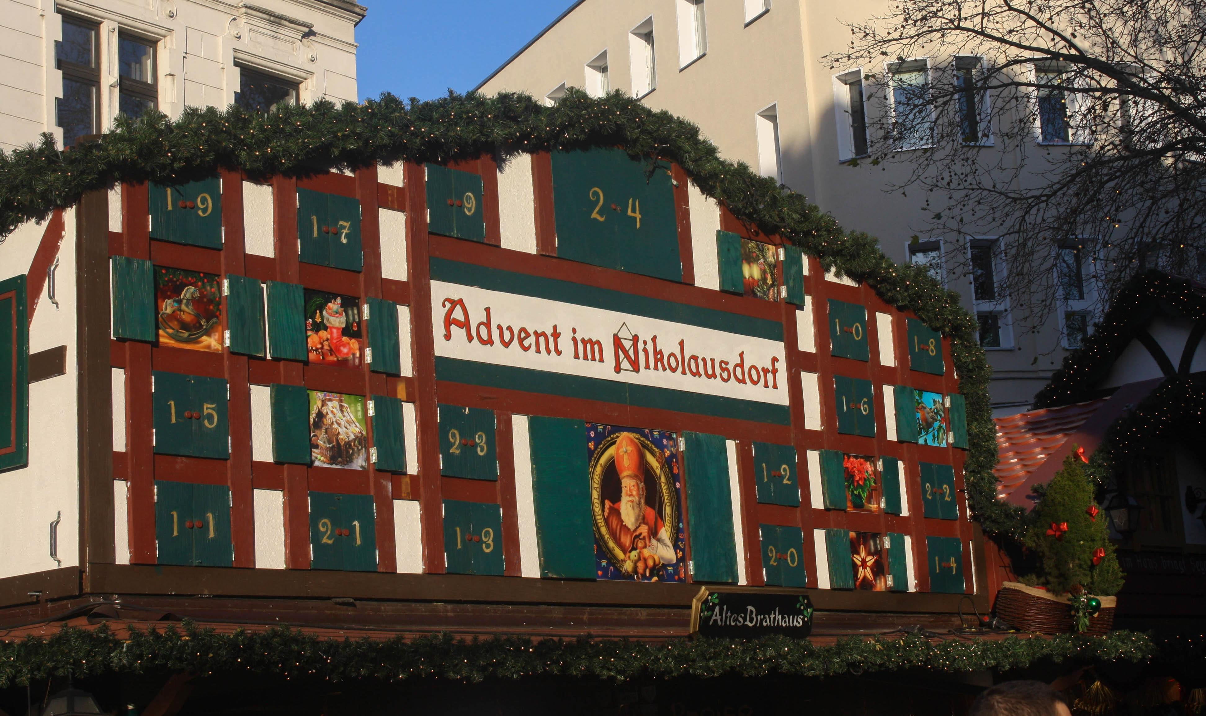 The first market I came to was the Nikolausdorf (St. Nicholas Village), occupying the Rudolfplatz in the shadow of the Hahnentorburg, the old gate from the early 13th century, rebuilt after the war. A couple of two-story gates marked the entrance to this especially attractive market, where the stalls were designed like half-timber houses, one with an enormous Advent calendar on its gable, ticking down the days until Christmas. Festive wind chimes tinkled in the soft breeze. Nutcrackers ranging in size from a small Christmas tree ornament to a small child stood in orderly rows waiting to be purchased—mostly soldiers, but when I looked more closely, I also spotted Scottish drummers wearing kilts, and chefs holding spatulas and clad in red-and-white checkered aprons.