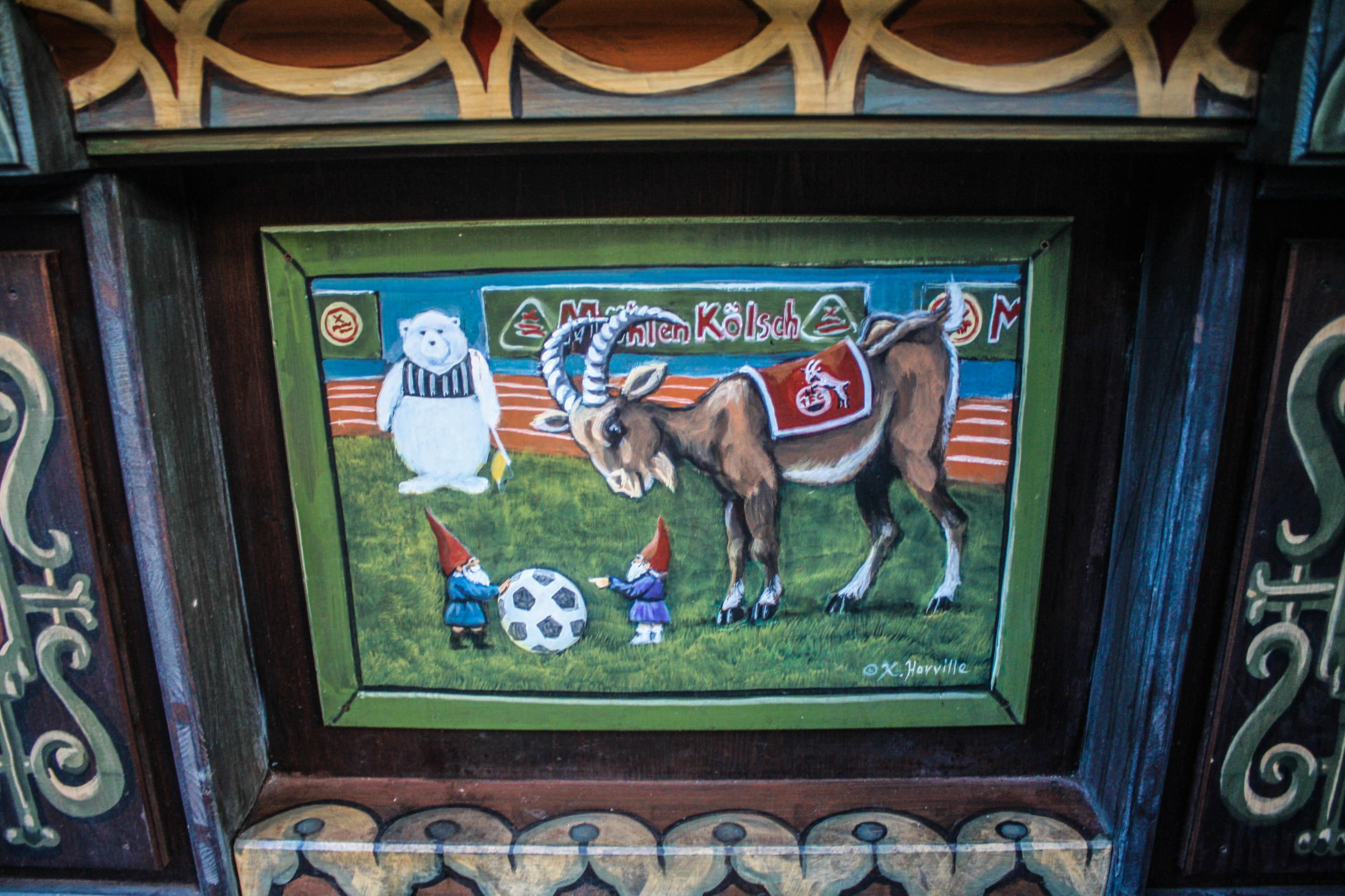 Just steps away from the museum, I stumbled upon the small Harbor Christmas Market. But time was escaping me, and two more markets still remained, so I gave it only a quick perusal before walking to the Christmas Market on the Alter Markt (Old Market). The main entrances welcomed visitors to pass between four-tiered ziggurat towers with Gothic windows and into the Heimat der Heinzel (Home of the Elves)—the first indication that this large market would be a little bit quirky. It didn’t take me long to start noticing the elves everywhere—standing on the roofs of the chalets; featured in the design of the signs for the flammlachs (“flamed salmon”) stall, roasting some fish over an open fire, and for the crêperie, standing behind a crêpe three times its size; riding in the ski lift over the ice-skating rink; and, my favorite, on a sign at a food stall, posing as the Three Wise Men, on their way to Bethlehem from Cologne, toting—instead of gold, frankincense, and myrrh—a beer, a pie, and a sausage (which may never reach its destination, given the expression of its carrier, with his tongue smacking his lips).