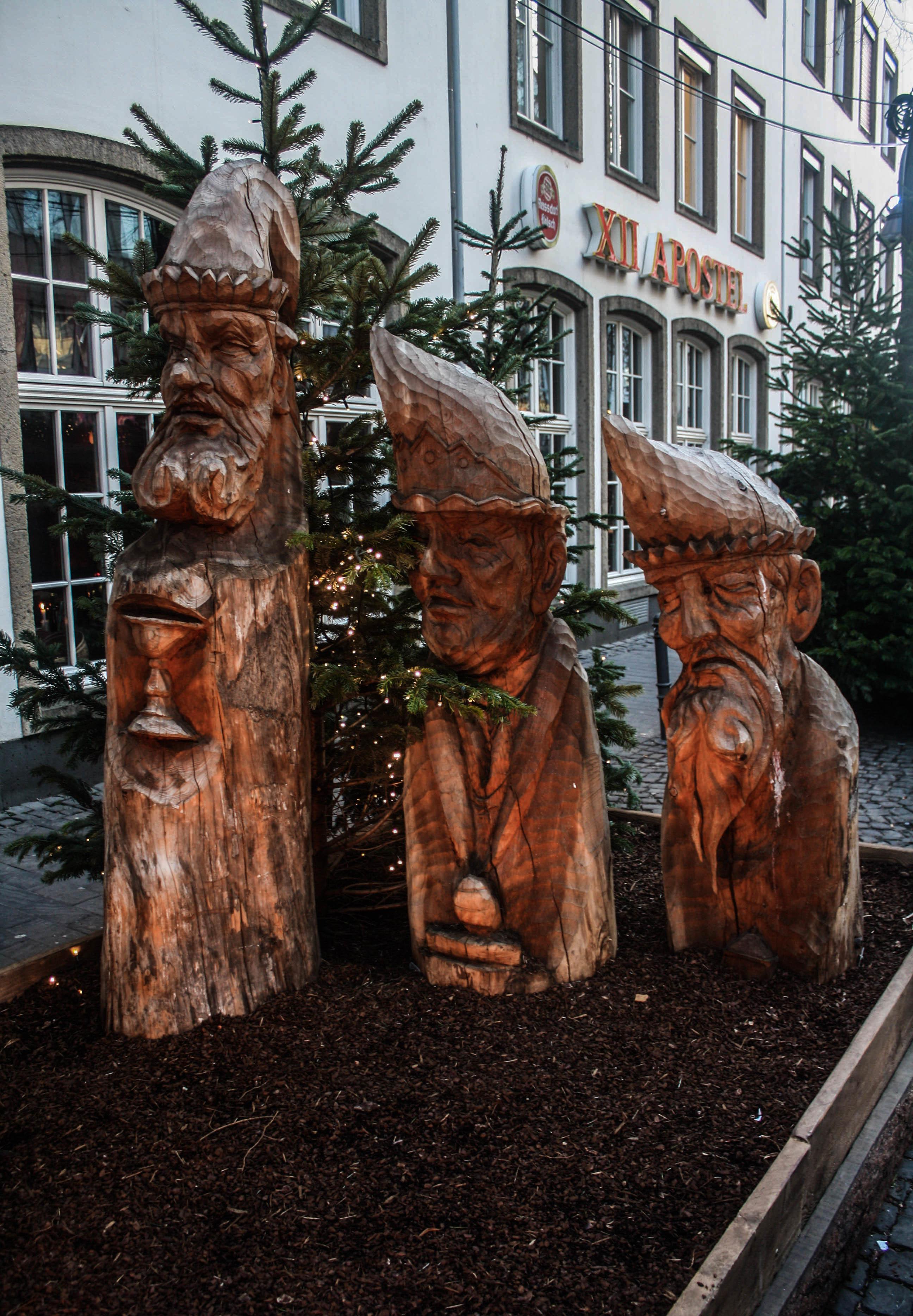 Just a few blocks from there, past the Basilika St. Aposteln (Basilica of the Holy Apostles), a striking Romanesque church from the 13th century with an octagonal dome, I came to the Markt der Engel (Angel’s Market), occupying the entire Neumarkt square and emerging as the prettiest market I had seen. As the name implies, hosts of angels both decorated the vendors’ chalets and stood ready to be purchased in all sorts of media. Stands selling glühwein bore such heavenly names as “Cloud Nine” and “Gabriel’s.” Although they were the pronounced motif here, these supernal beings didn’t hold a monopoly—moose, gnomes, reindeer, and other Christmas and winter figures embellished the stalls, all trimmed with garlands of green. White stars dangled from bare, patulous tree branches that formed a canopy over the market. Mounds of roasted mandeln (almonds) and other nuts stirred my appetite, and a bag of them found itself in my hands for a snack later on as I munched on a pretzel baked with cheese.