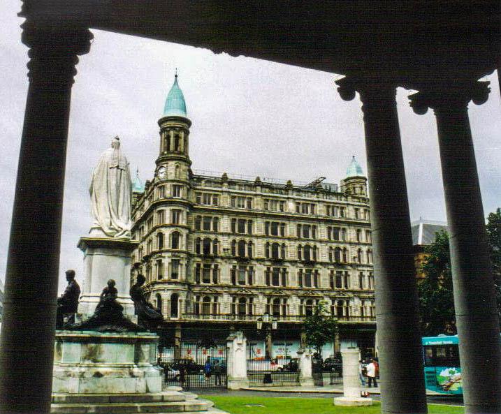 The columned classical portico is all that remains of the old Donegall Square Methodist Church, replaced by the blah Ulster Bank. Its neighbors include the vaguely art deco Imperial House and the grand Ocean House, a red, Scottish baronial Tudor from 1902 with sculptures of mermaids holding shields and an angled front door that could easily pass for the main egress of a castle.