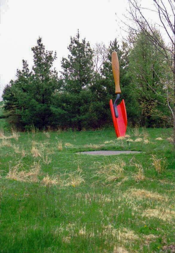 Not all the sculptures here, of course, are so cerebral. There’s plenty of whimsy, too. At just shy of 24′ tall, Plantoir is hard to miss. Set in a green field with green trees as a backdrop, the bright red blade of this huge trowel, plunged into the earth, coaxes your eye. Husband and wife sculptors Claes Oldenburg and Coosje van Bruggen extend their philosophy that everyday objects can be transformed into art to this playful piece—an ordinary garden tool into a colossal stainless steel, aluminum, and fiberglass sculpture, brightly painted. I’m not sure I would consider it “art,” but this piece certainly evoked a smile from me, thanks to its cheery color and nonsensical height of a simple handheld instrument nearly as tall as the trees behind it.