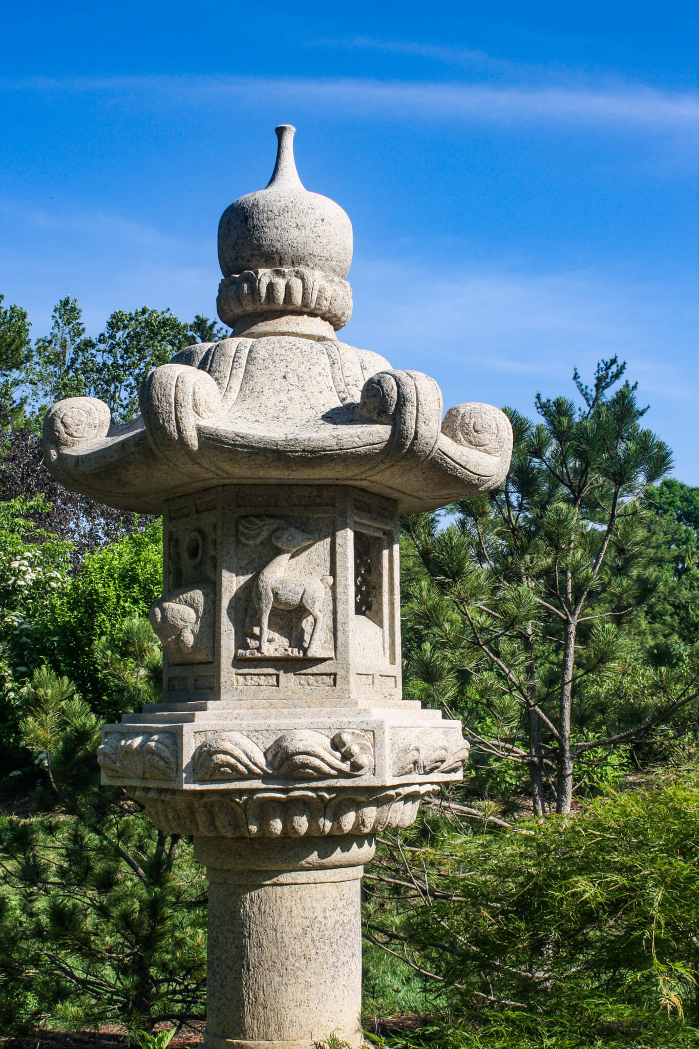 I moved through an international trio—the German, Bavarian, and English Woodland gardens—before arriving at a fourth, the wonderful 14-acre Seiwa-en Japanese Garden. Popular among 17th- and 18th-century Japanese feudal lords, these gardens typically feature lawn areas, architectural and water elements, and symbolic flora. The one in St. Louis—one of the largest Japanese gardens in the United States, and one of my favorite sections here—invited me to discover along its winding path. The irregularly shaped four-acre lake is the central focus, and from any spot along its perimeter I found a different vista—a concentration of lily pads, ducks rippling the placid surface as they traversed the water, the carefully designed waterfalls, the raked dry gravel gardens with patterns representing ocean waves and with circles so perfect they would surpass any mathematician’s compass. Four islands float in the lake, one of which is accessible by foot via traditional Japanese bridges, including one arched bridge that makes a circle in its own reflection in the water. A herringbone-pattern wooden boardwalk zig-zags over part of the lakeshore, and flat stone benches in the shape of flowers provide a peaceful place to sit and contemplate the brilliant maroon leaves of the Japanese maple tree above you. Stone lanterns add more authenticity to the garden, and the koi pond introduces you to some very hungry fish.