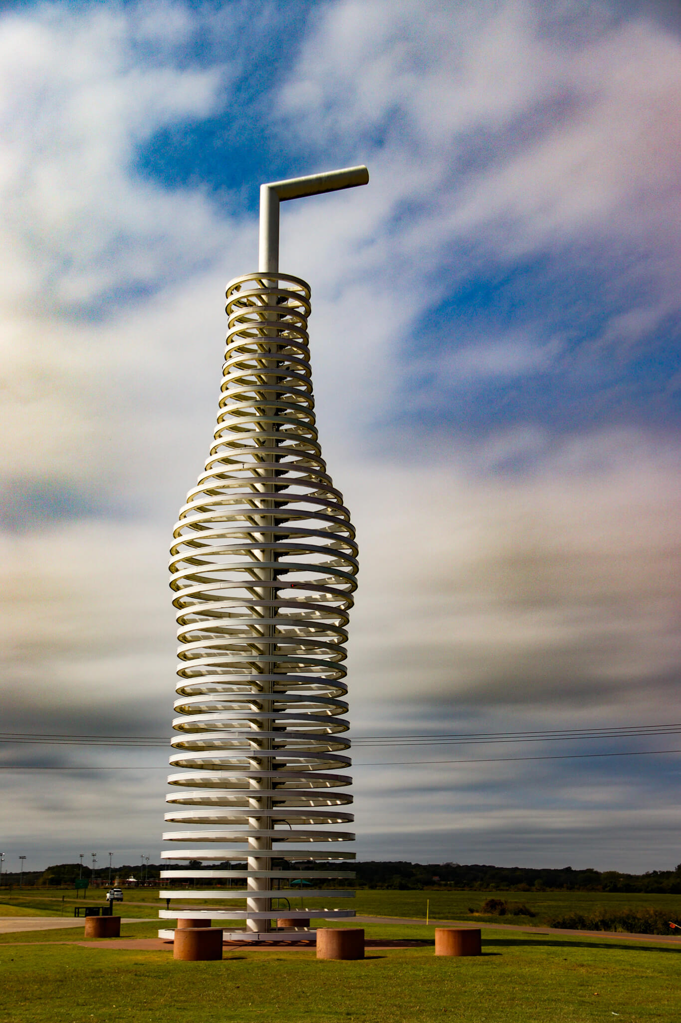 I found a much newer attraction on Route 66, also in Arcadia, just a few minutes away. Pops 66, a roadside hybrid gas station–diner–soda shop, opened only in 2007. You can’t miss it: An extremely tall (deliberately rising 66’) soda bottle, made with steel hoops (and complete with a straw) whose thousands of LED lenses are illuminated at night in rich neon colors, is an eye-catching and irresistible sight right along the road. A massive cantilever roof extends out over the gas pumps and entrance. Although all modern on the outside, the diner, with booths and counter service, feels like a 1950s hangout straight out of Grease or Happy Days, with burgers and shakes at the top of the menu. The big draw, however, is the soda shop. With 700 different sodas (or, in Midwestern American, pops) and drinks available for sale, I spent far too long browsing the shelves for something to satisfy my sweet tooth. Although I succumbed to giving myself a cavity with a couple of bottles—grape and lime—I had to assume that other flavors are geared toward the truly courageous or unabashedly curious: grass, bacon, peanut butter and jelly, kumquat, ranch dressing, sweet corn, and beef jerky.