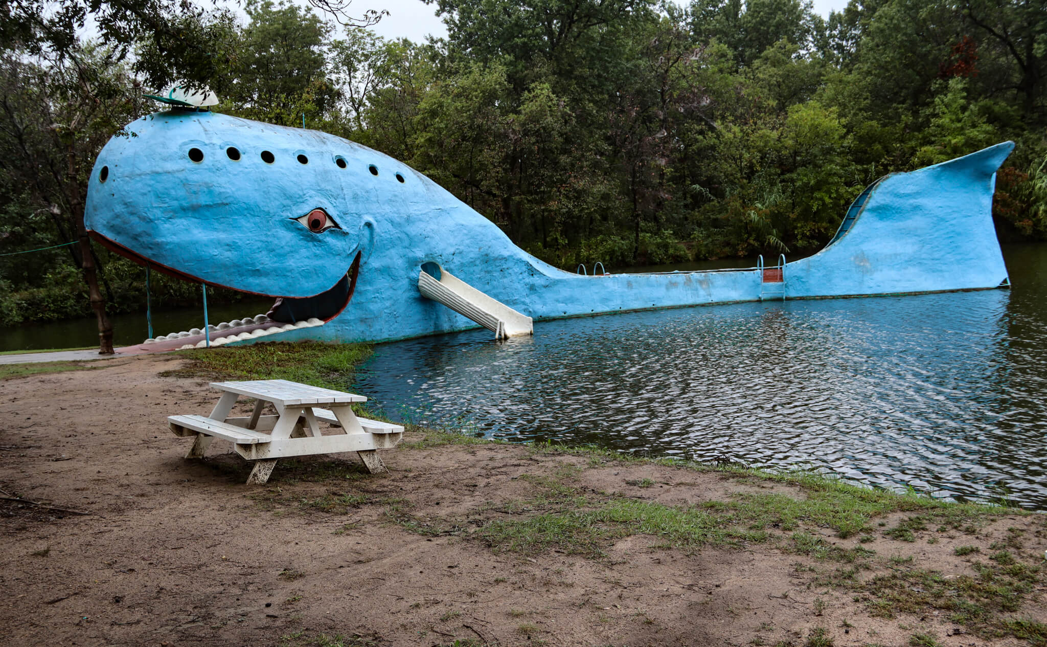 A dozen miles away, I stopped at one of the most offbeat and most iconic attractions at any point on Route 66, in the small city of Catoosa. It’s hard to miss the 20’-tall, 80’-long blue whale just off the side of the road. Floating in a small pond and made of iron and cement, painted blue, and wearing an undersized baseball cap, the Blue Whale has been an oddball curiosity since 1972, when it was born as a husband’s anniversary gift to his wife, who collected whale figurines. It grew into a popular swimming hole for both locals and travelers, who could walk into the mouth of the whale, Jonah-like, and then slide or jump into the water. Although it has been closed since 1988, I was still able to walk around it and laugh at its weirdness.