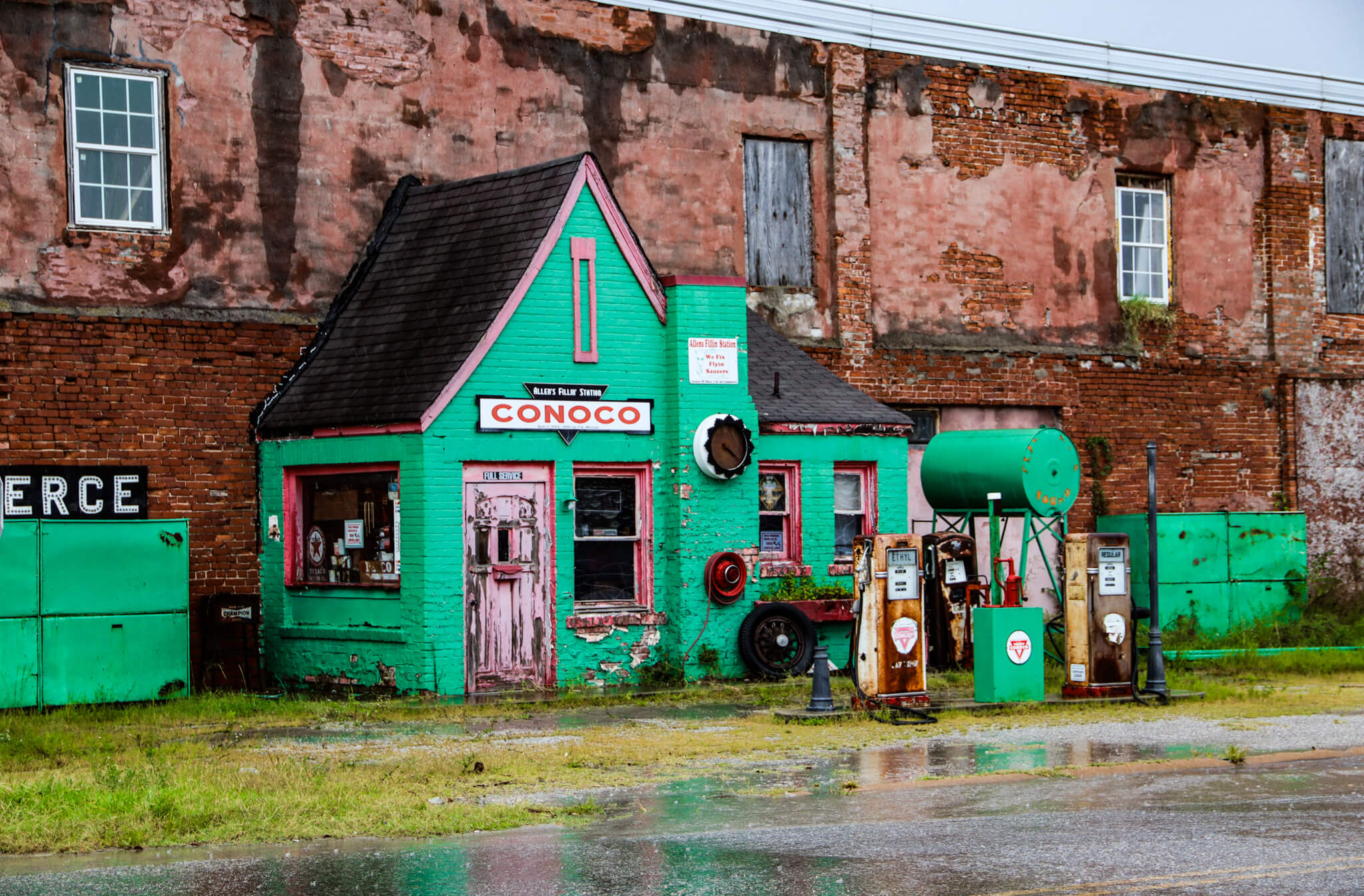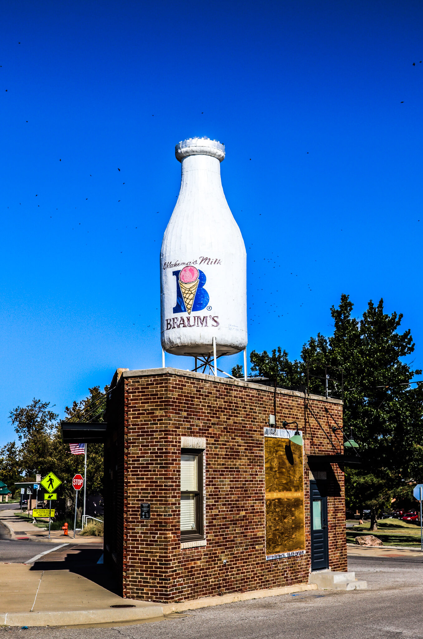 Just a couple of blocks away, the isolated Milk Bottle Grocery sits on its own triangular island in the middle of a busy street. Like Gold Dome, this structure is also abandoned, despite being listed on the National Register of Historic Places in 1998. Built in 1930, the one-story brick wedge was known as the Triangle Grocery from 1940 to 1948, when the name changed with the addition of its defining characteristic—a giant milk bottle, as tall as the building itself, on its roof. An ice cream cone on a background of a blue “B” is painted on two sides of the white bottle, with “Braum’s” (a well-known Oklahoma-based dairy) below it and the company’s slogan, “Oklahoma’s Milk,” above. The bottle was added to the newly christened Milk Bottle Grocery to attract the attention of drivers along Route 66 as well as to advertise the state’s dairy industry.