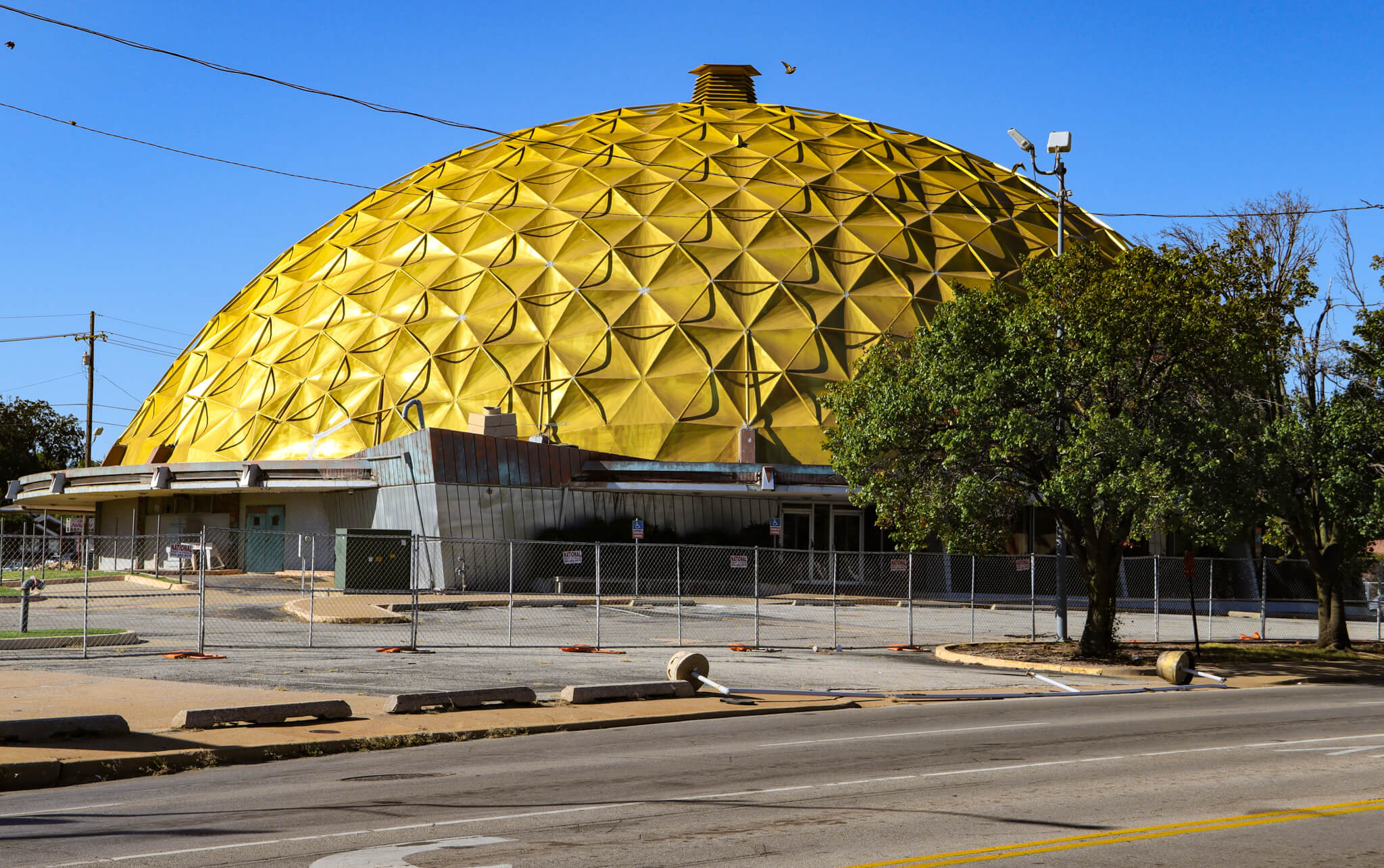 Two of the city’s stranger Route 66 sites, unfortunately, remain shuttered. The first, the Citizens State Bank, better known as Gold Dome Building, looks like a shiny alien spacecraft straight out of a 1950s science fiction B-movie. The world’s fifth geodesic dome to ever be built—and the first bank in the world constructed in this style—bears 625 gold panels atop its short base and sports a diameter of 145’. After the bank closed, it remained abandoned for years and has clearly lost some of its luster. But salvation is near: Added to the National Register of Historic Places in 2002, Gold Dome has been purchased and is slated for renovation and repurposing, keeping the iconic dome intact.