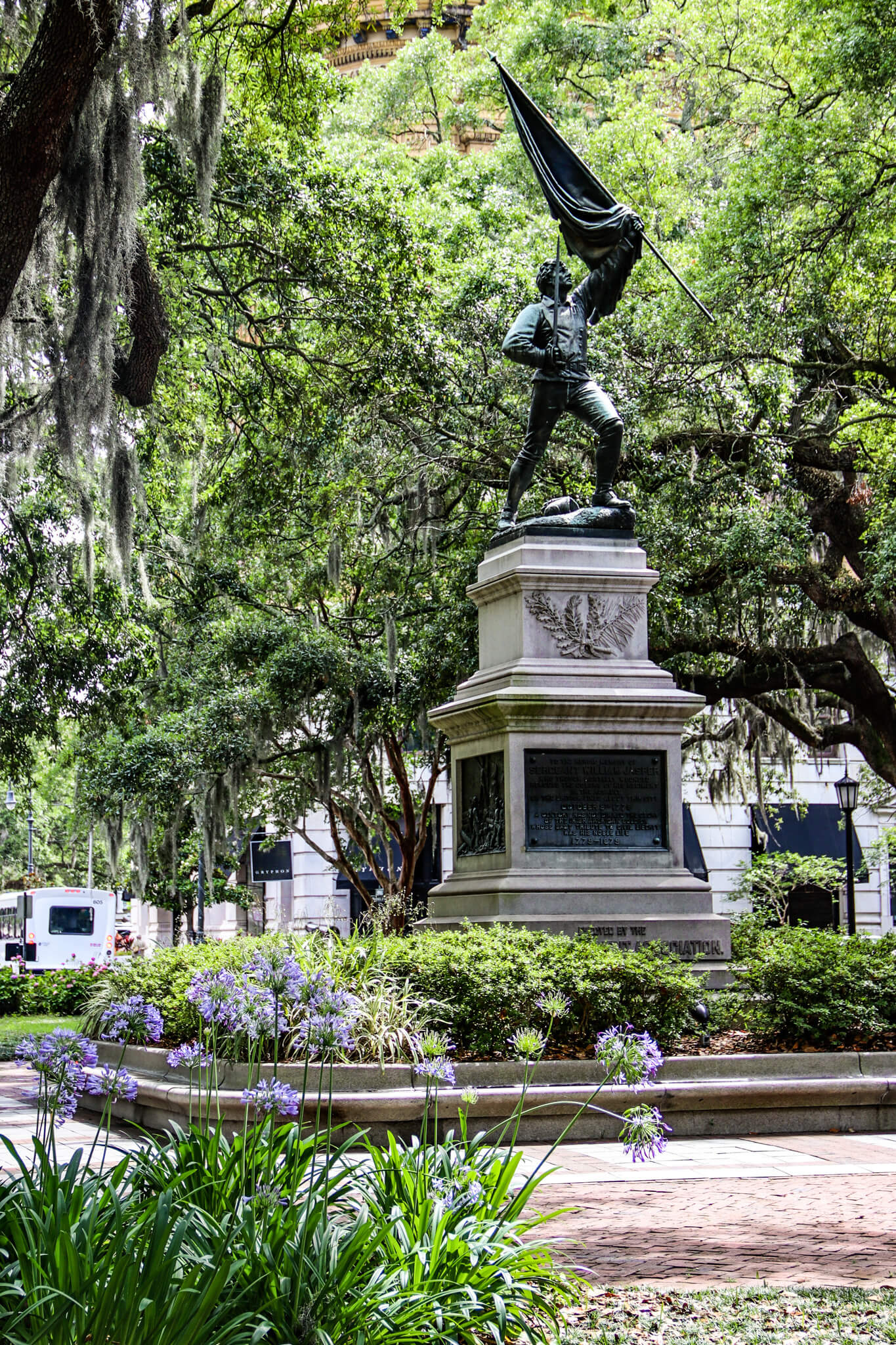 Madison Square—On the south side of this square, laid out in 1837 and named for President James Madison, you’ll find two terrific buildings, both now part of SCAD: the old Savannah Volunteer Guard Armory (from 1892), now Poetter Hall, and the old Scottish Rite Temple (pop in to the ground-floor Gryphon Tea Room (formerly a pharmacy) for superior Italian wedding soup). At the northeast corner, make sure to visit the friendly and well-stocked E. Shaver Booksellers. There’s also the lovely St. John’s Episcopal Church, from 1853, as well as a haunted house or two. At the center of this welcoming square stands the dramatic monument to Revolutionary War Sergeant William Jasper, here depicted raising his company’s banner even though he was mortally wounded (and died just steps from the square) and holding his fatal wound with the other hand, his bullet-ridden hat at his feet. Each frieze on the four sides of the base depicts key moments in his military career. A couple of vintage cannon from the Savannah Armory are also in the square.