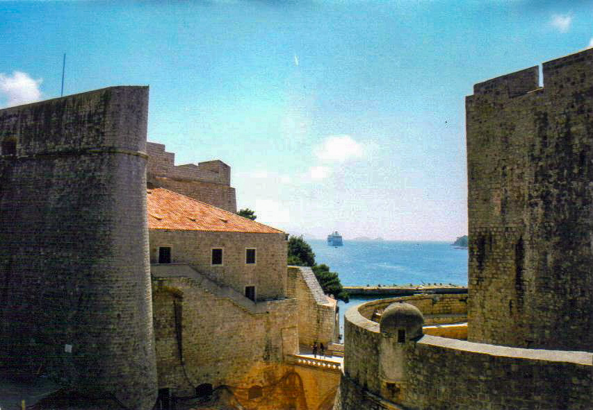 I turned toward the sea to begin my trek. The walls facing the Adriatic Sea measure anywhere from five to 16’ thick, built to defend the city from sea-based attacks. Below me, a single cannon (one of 120 that had defended the city) pointing toward the water rested on top of cylindrical Fort Bokar, built in the 1460s as one of the main defenses of the western part of the city. Across the small harbor, St. Lawrence Fortress stood ready to defend Dubrovnik from atop a rocky promontory, 121’ above sea level.