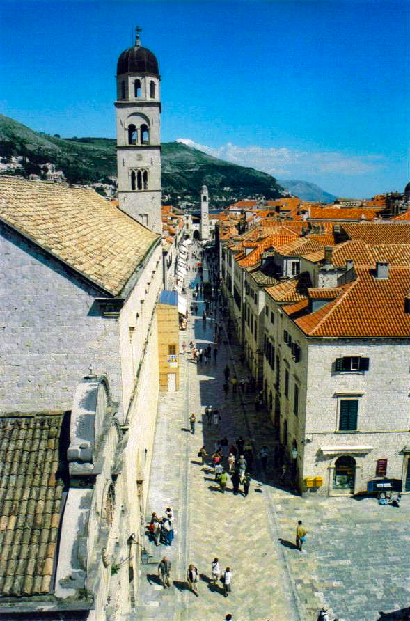 From this initial vantage point, I looked down at the entire length of Stradun, lined with churches, shops, restaurants, cafés, and a small square with a fountain at either end, and then up at the green and brown hills rising from the city’s eastern fringes.