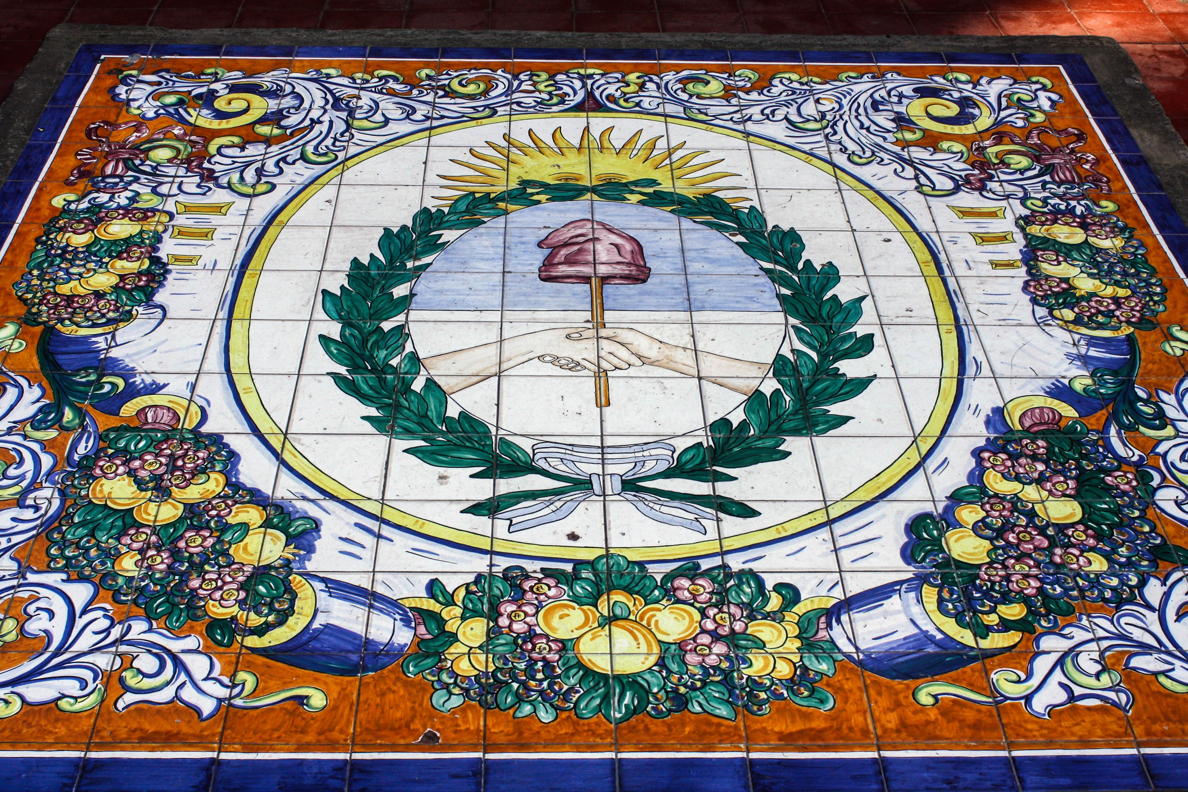 I skirted around the large tile array of bountiful fruits and flowers surrounding the Argentinean coat of arms—a green wreath tied at the bottom by a ribbon of the blue and white of the country’s flag and capped by a rising sun, encircling two shaking hands holding a pike topped by a red Phyrgian cap against a blue and white background. Above me, two female figures—a Spanish noblewoman holding a book and a Mestiza holding a bunch of grapes—stand on either side of a relief of a Spanish sailing ship, which rests on top of a base featuring a relief of a man tilling the soil behind a team of two oxen. The entire arrangement sits atop the central part of a monumental wall divided into panels of vibrantly colored tiles portraying, among other images, Columbus discovering America, the founding of Mendoza, a scene from Don Quixote, and missionary work.