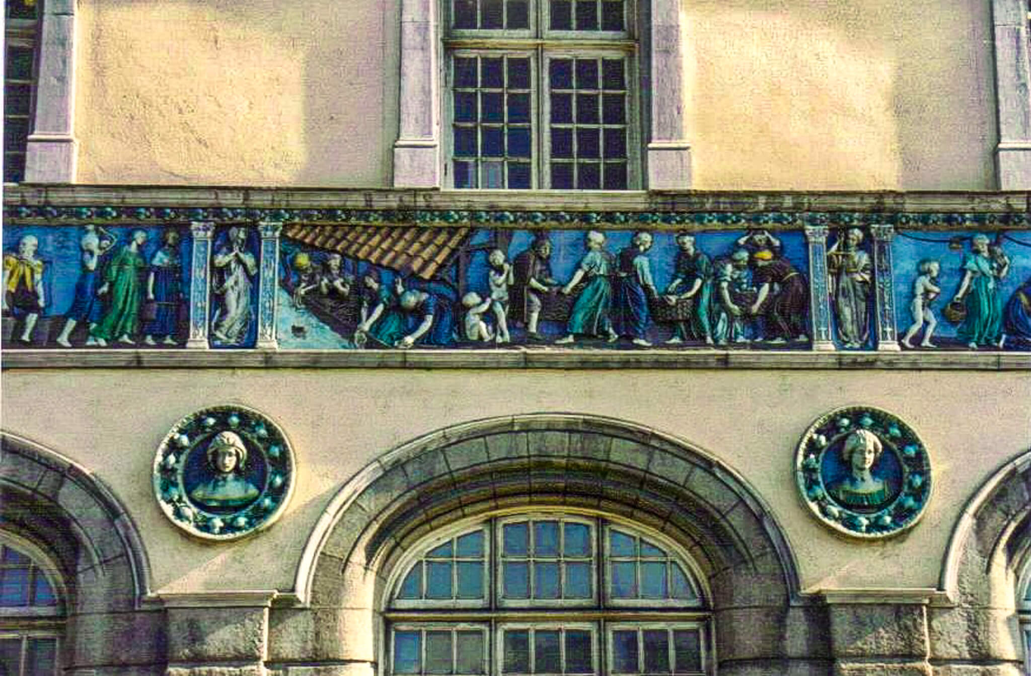 This corner building along the River Liffey in Dublin was completed in 1910 in the Italianate style, an anomaly among its Georgian and Victorian neighbors. The commercial office was constructed as the Irish headquarters for Lever Brothers, a British manufacturing company that teamed up with a chemist to create a soap that used glycerin and vegetable oils instead of tallow, the result of which was a soap that was free-lathering. Christened “Sunlight Soap,” it leant its name to this structure. The peach façade features arched windows, elaborate wooden carvings depicting the elements sheltered under overhanging eaves, and a red terracotta roof. But the real delight for me is the ornate frieze that belts around the building’s three sides. Set in 12 panels above the first and second stories, intricately molded glazed terracotta figures in white, yellow, blue, and green depict the history of hygiene and soap—men making clothes dirty while they’re at work in agriculture and industry (extracting and producing the ingredients for Lever Brothers products), and women washing them in streams, carefully placing them in baskets and trunks. While this wonderful ornamentation served as a terrific 20th-century advertisement for Lever Brothers, today the frieze is a treat for anyone who looks up at this bit of whimsy in Dublin’s popular Temple Bar neighborhood.
