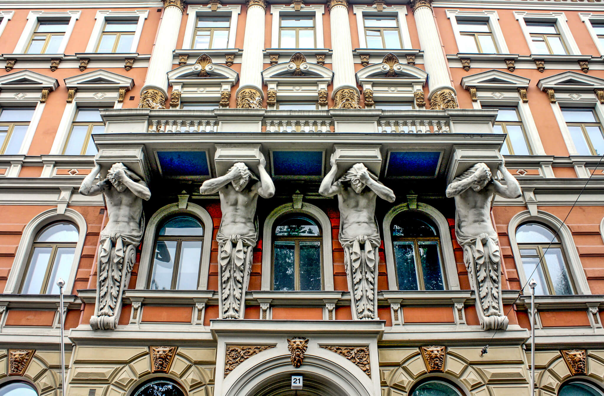 What goes around comes around, but at Ohranan House, the middle part is a little dark. Completed in 1889, the beautiful six-story neo-Renaissance building was originally an apartment block for Helsinki’s well-to-do. With its multitude of windows, corner tower, balconies, and double cornice, it was an enviable address indeed. That didn’t last very long, however: The Russian state bought it in 1904, and, soon after, it housed officers of the Russian army as well as the Finnish branch of the Russian secret police Ohrana. After Lenin abolished Ohrana in 1917, the newly independent Finnish state became the owner, ushering in decades of use by the Department of Defense, the General Staff, and the Border Guard. After a period of disuse, a luxury residential developer purchased it in 2012, and, once again, Ohranan is a lavish apartment building, re-christened Grand Residence 21, a far cry from its abandoned years when locals referred to it as “dead corner.” Owner-residents—corporate executives, investors, and heirs—enjoy solid wood floors, natural stone, Finnish-made furniture, sauna areas with bathtubs, 70 original and refurbished tile stoves, such concierge services as cleaning, laundry, and car maintenance, and an automated underground parking system in what used to be the auditorium—drivers pull up onto a platform and then send it by elevator to the desired floor of the parking lot. Although the interior must be magnificent, the façade is pretty impressive, too, especially the quartet of atlantids on the third floor supporting a balcony for a fourth-floor apartment. The brackets of the balcony rest on the shoulders of each of them, but two of them use additional support with their left hand, two with their right. Their free hands pull at their hair, perhaps in their struggle to hold up the structure, perhaps in their historical embarrassment as a home to Ohrana.