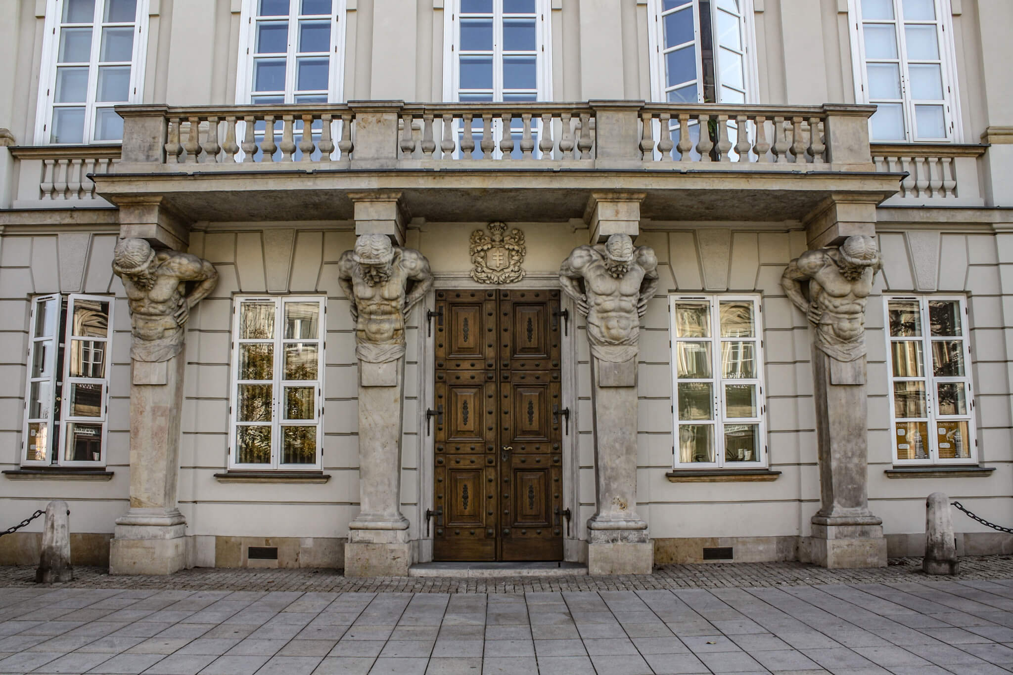 No expansive grounds. No guarded gates. It’s simply there—a splendid palace right along the sidewalk of one of Warsaw’s grandest streets, Krakowskie Przedmieście. Completed in 1792 as a home for the Tyszkiewicz family, the palace is still regarded as one of the most beautiful neoclassical buildings in the city. Ownership changed hands in 1840 to the Potocki family and remained so until sometime after World War I, when it became the home of a bank and, later, the Polish Academy of Literature. That was all wiped out in 1944 when Warsaw was being decimated and the palace burned down. Rebuilt after World War II, it’s now a museum of Warsaw University. By far, the most arresting feature can be found at the only entrance on the long western façade. Four elegant stone atlantids, from 1787, support a central balcony on their necks and trapezii. Nearly identical, the four look down, perhaps admiring their own abdominals. With hands resting on their lats, they could almost be poising for a bodybuilding competition. They’d probably win, too, but they are, in fact, carrying a lot of weight and history on their overdeveloped shoulders.