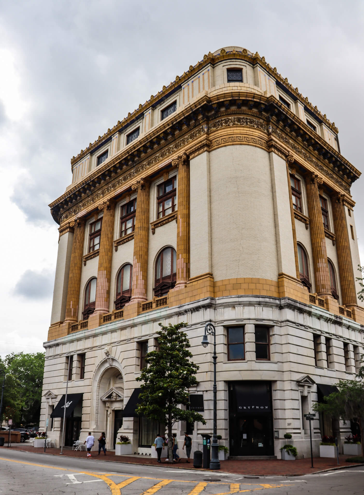 Following an outstanding dinner along the Savannah River at River House Seafood the night before, I was now hunting for a unique lunch spot in the best historic district in the United States. Directly across the street from Madison Square and located on the street level of the former 1923 Scottish Rite Masonic Temple, one of the most beautiful buildings in Savannah, the Gryphon Tea Room seemed like the ideal place for a midday meal. Part of the Savannah College of Art and Design campus (one of the top five college campuses), the Gryphon is housed in a space formerly occupied by a pharmacy. Inside, a large chandelier hangs from a gorgeous stained-glass ceiling panel, and green and white stained-glass globes provide additional lighting. Drawers with such labels as Camphor Gum, Eyedrops, Tablets, Alophen Pills, and Ointments are topped by carved mahogany and glass-front bookcases formerly for medicines, tinctures, capsules, tonics, and salves, and now holding an eclectic selection of books, from War and Peace to The Existential Pleasures of Engineering. A series of stained-glass panels with an apothecary’s pestle and mortar runs above them. You’ll probably want to stop here for afternoon tea service in this cozy and historic locale, but you can also enjoy a refreshing Atlanta peach (peach nectar, fresh lime juice, and ginger-infused sparkling water), some superior Italian wedding soup, and a prosciutto baguette with Manchego cheese, fig spread, arugula, and pears.