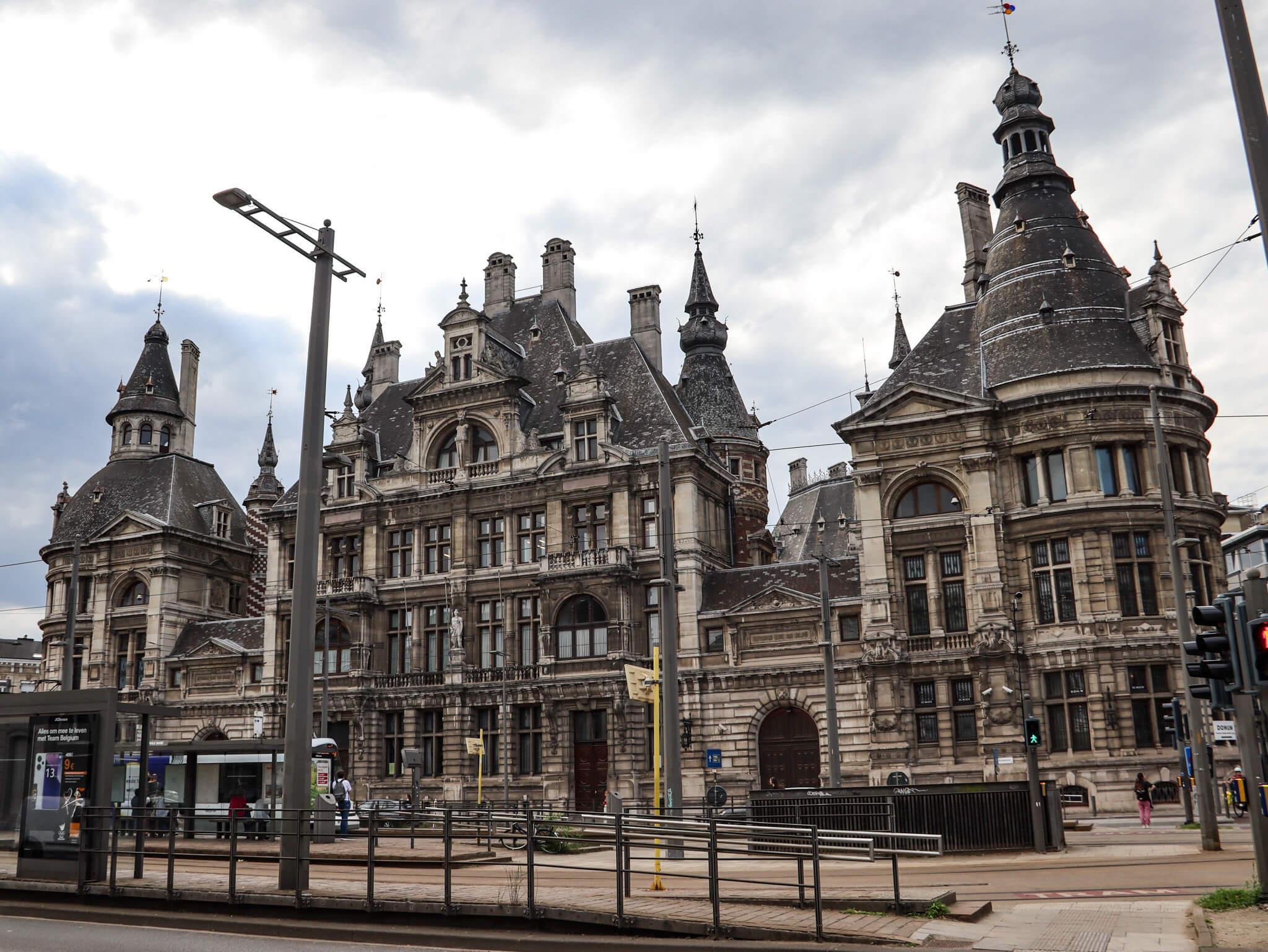 The National Bank of Belgium ended its banking activities in this building in 2013. But, up until then, the world of finance was conducted in this most spectacular building. The NBB was created in 1850, originally operating in a townhouse. As Antwerp expanded, the old Spanish defensive walls were demolished, broad avenues were created, and space opened up for a new NBB location. In 1879, this massive structure, eclectic in style with a nod toward the neo-Renaissance, opened for business. As I stepped off the streetcar directly in front of it, I was instantly bowled over. Triangular in shape, the bank looks more like a Loire Valley castle than a financial institution. The central section is a riot of brackets, statues, balconies with balustrades, griffins, gables, chimneys, big and tiny dormer windows, and a steeply pitched roof. Two low arms, with the name of the bank etched in a panel above the heavy arched wood doors, connect to monumental corner towers with different roofs, both topped by whimsical weather vanes.